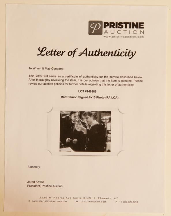 We have for sale a Signed Matt Damon Dogma Movie Still Photo 8" x 10" with a Pristine Auction Letter of Authenticity. This signed print will make a great addition to any Matt Damon fan's collection.