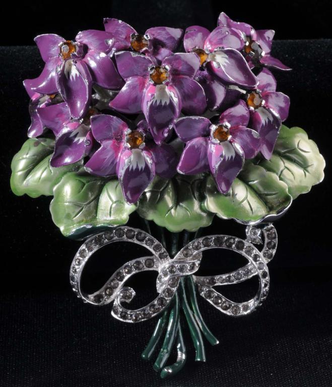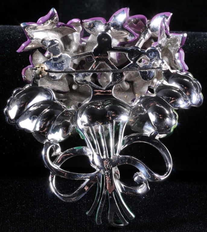 Description Purple enamel loss to edges of flowers and some enamel loss on stems and dark stones on bow. Condition (Good). Size 3" x 2 - 3/4".
