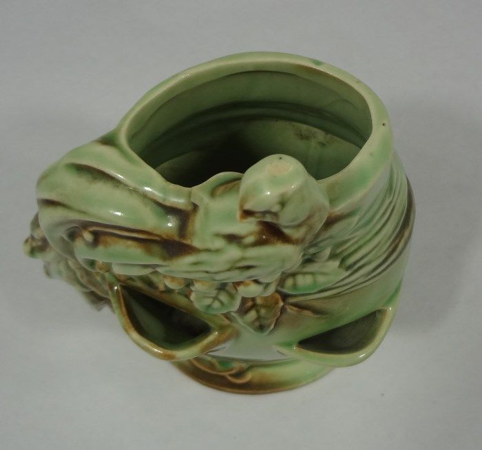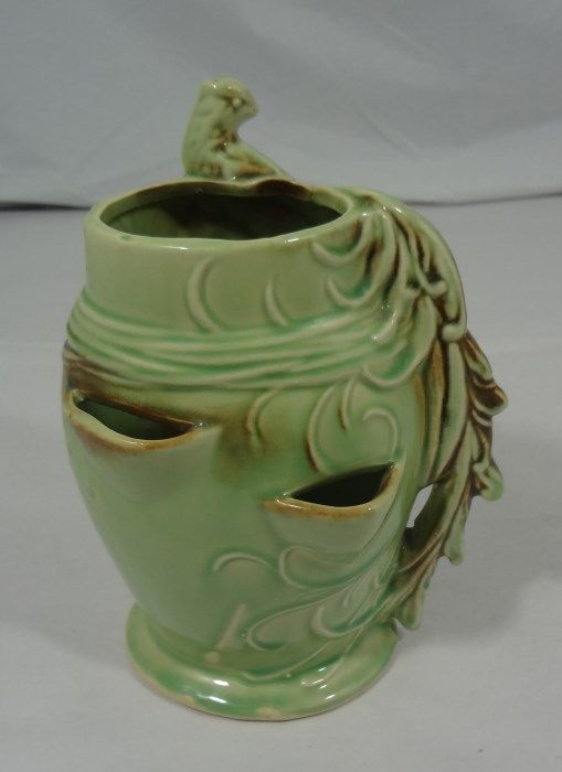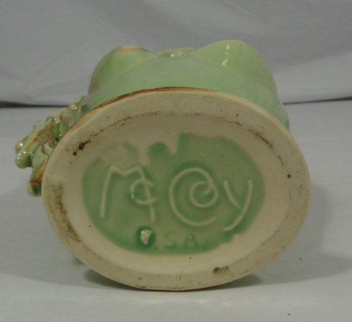 McCoy USA flower vase/planter in glossy green and brown tones. Measures approximately 8" tall and 7" wide at widest part. This piece is in nice condition and would be a great addition to any collection! Est Value $20.00-40.00
