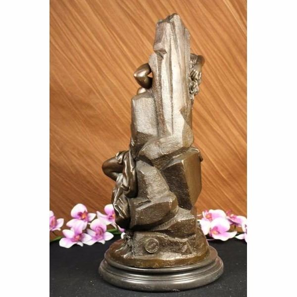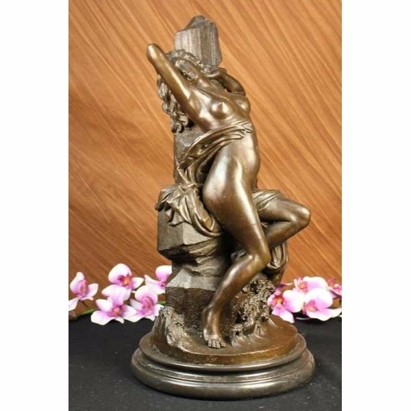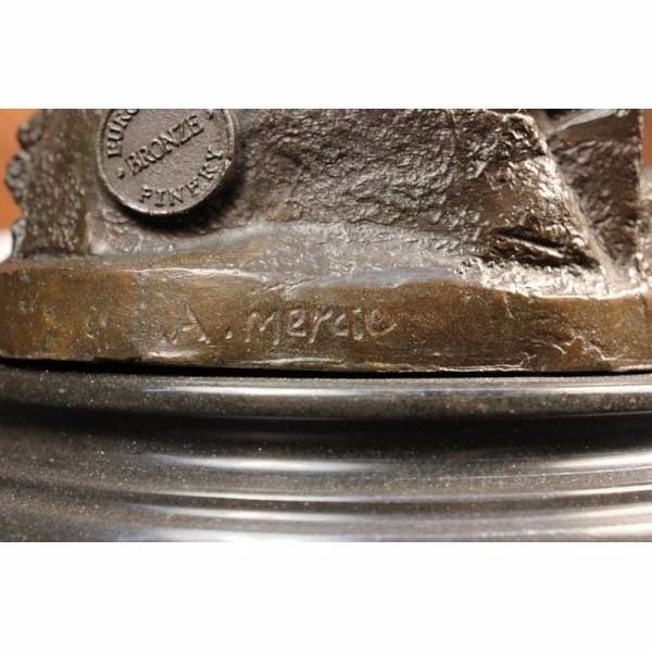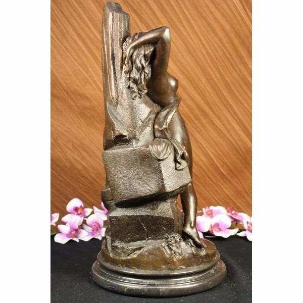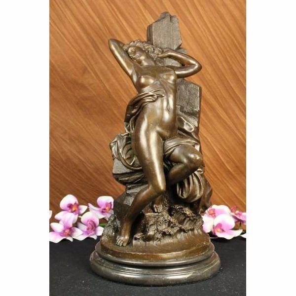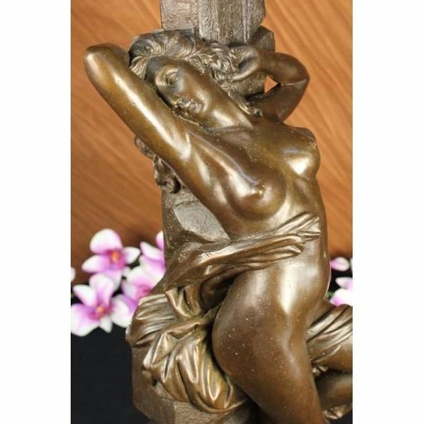 This gorgeous sculpture of a woman posing for the camera is astonishing. she leans back on a pillar of some sort and lets her body do the talking. She looks amazing as she stay still with her right arm covering the side of her face, and the other one grabbing the pillar. Her scarf is place gently around her stomach and then it wraps around her inner thighs leaving her completely exposed for the eyes to see. This sculpture is a classy yet simple way to add a touch of charm to your home, office, or studio. This sculpture was cast using the "Lost Wax Method" and has a light brown patina with touches of gold highlights. This sculpture is handmade and 100% bronze and is mounted on a black marble base. this sculpture is signed by A. Mercie Condition: This sculpture is in perfect condition. Bronze Dimensions with Marble Base:Height 20" x Width 10" Marble Dimensions:Diameter 10" Height without base: 19" Weight :30 LBS Inventory : 18X205010181