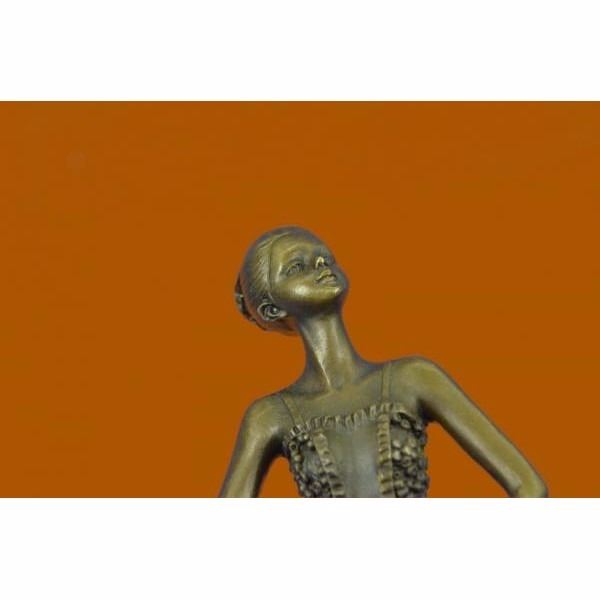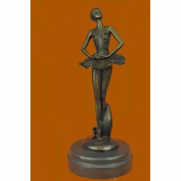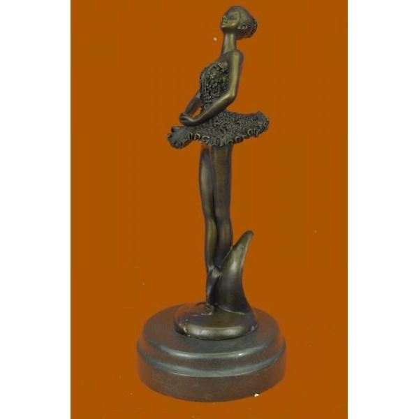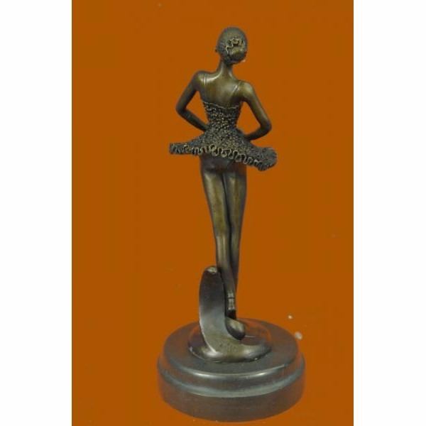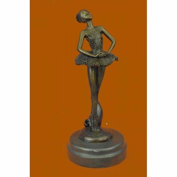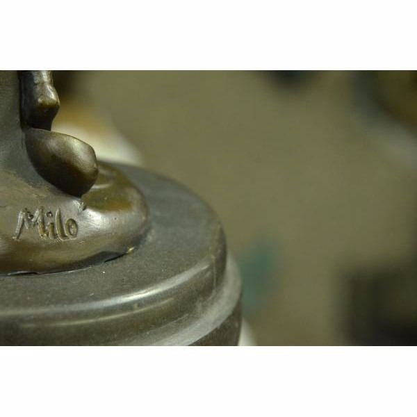 A prima ballerina puts on a show. Well trained in the art that she loves, she shows off her agility, balance and flexibility. She elevates her long leg far behind her. Her chest pushes out and her head tips up to the sky, basking in the glory of being center stage. Her spine curves, touching her back to her tutu. Her tutu spreads around her hips like a halo. Every movement is deliberate and structured, from the tips of her toes to the tips of her fingers. 100% bronze, this handmade brown patina sculpture was cast using the "Lost Wax Method" and mounted on a black marble base and is signed by artist Milo. Condition: this sculpture is in perfect condition. Bronze Dimensions with Marble Base:Height 10" X Width 4.5 " Marble Dimensions:Diameter 4.5" Height without base: 9" Weight : 5 LBS Inventory : 87YRD13032878