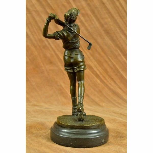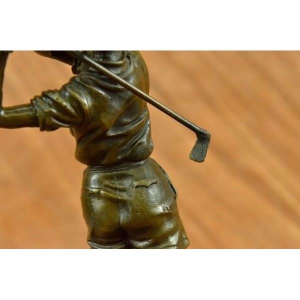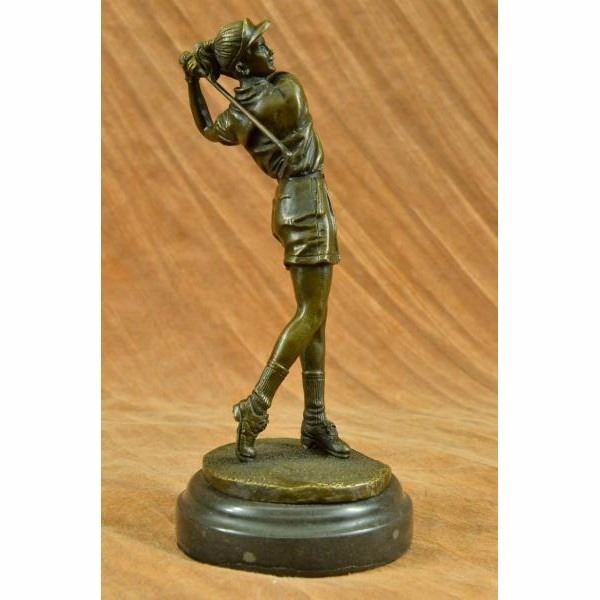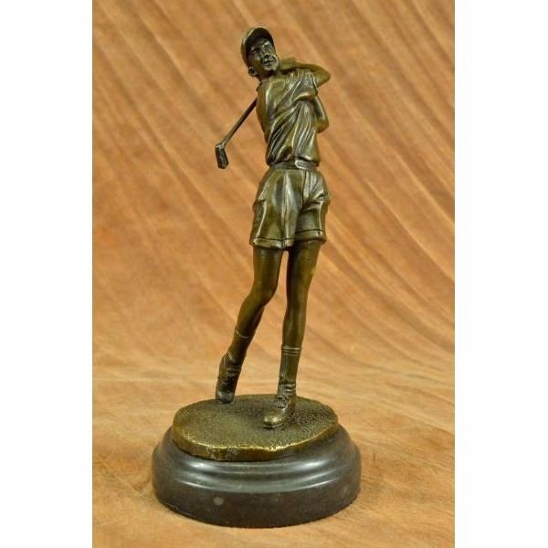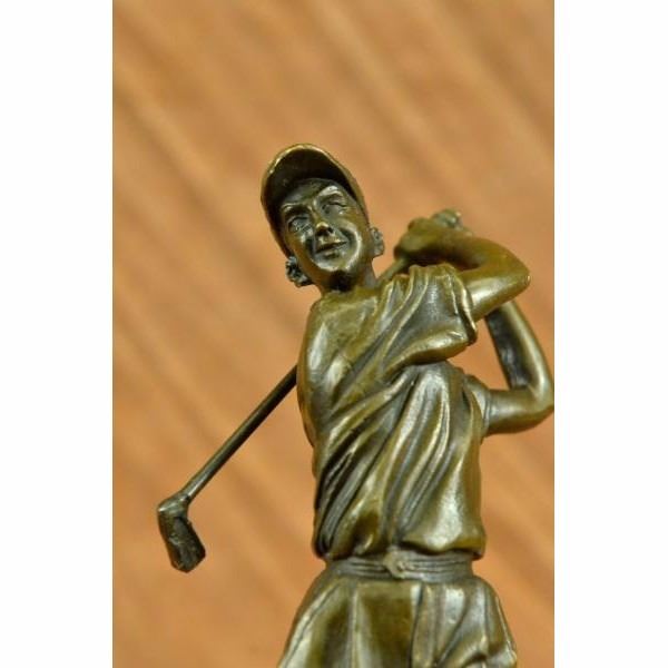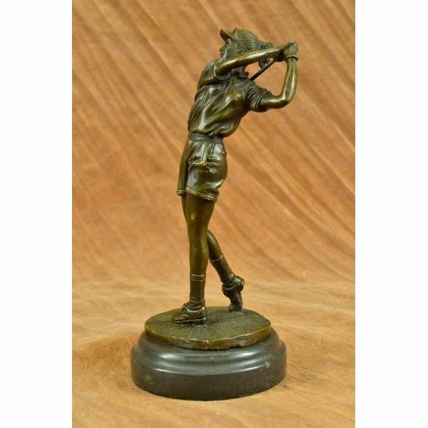A golfer tilts her head up to the sun and watches her ball rise. She holds her form and stance, tracking the position of the ball and how close to the green it may land. Her body twists with her stroke. In her head she counts the strokes she may need if it doesn't land on the green and how many she may need if it does. She silently prays that it doesn't land in a sand trap or near a water hazard. Though the crowd has already begun to erupt in an uproar, she knows it's too soon for celebration. The ball is left to the wind. She wears a cotton tee shirt, skirt, and cap. There are fine details to appreciate like the ripples of her moving clothes and the rough patches of the manicured grass. This handmade 100% bronze sculpture was cast using the "Lost Wax Method" and mounted on a marble base and is signed Milo. Condition : This sculpture is in perfect condition. Bronze Dimensions with Marble Base:Height 10" x Width 4" Marble Dimensions: Diameter 4". Height without base: 9" Weight : 5 LBS Inventory : 25YRD78429652