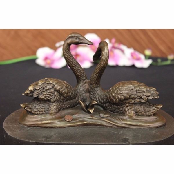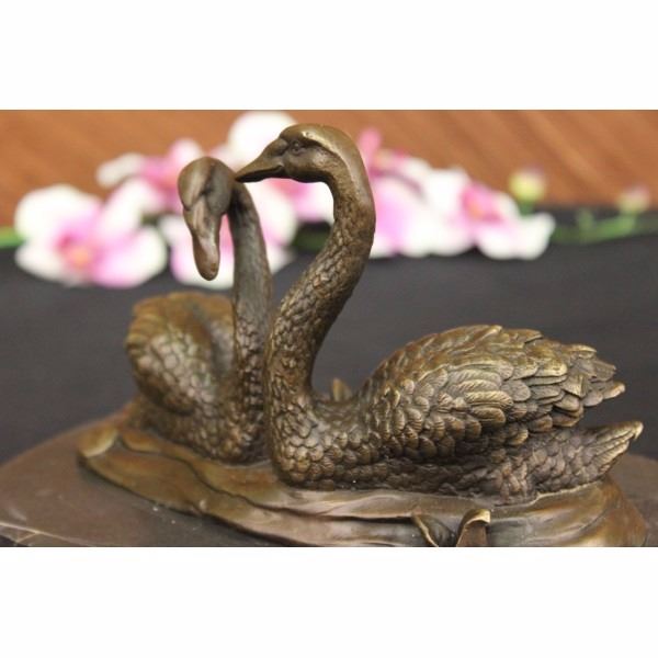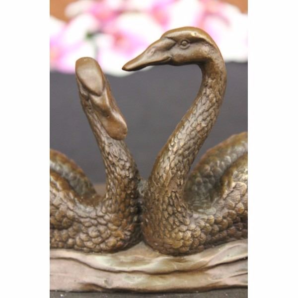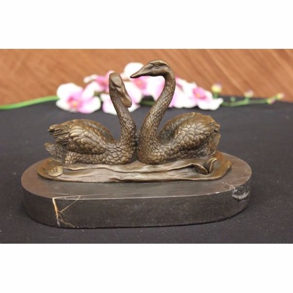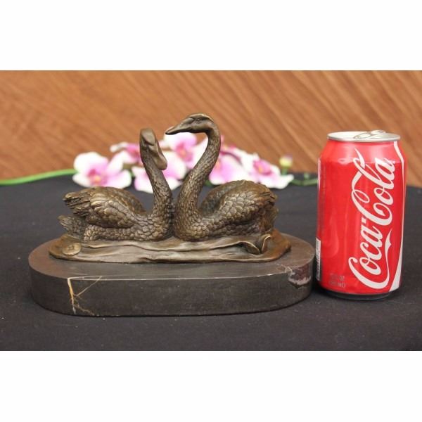 Two beautiful swans are facing each other as they float. Swans are a symbol of balance, grace and elegance. The artist has designed them wonderfully, paying attention to the curves on the feathers of their skin. This serene sculpture was crafted using the lost wax method. It rests on a black marble base. It is signed Milo. Condition: This sculpture is in perfect condition. Bronze Dimensions with Marble Base:Height 6" X Width 9" Marble Dimensions: Diameter 9" Height without base: 5" Weight : 8 LBS Inventory : 63Y3232636