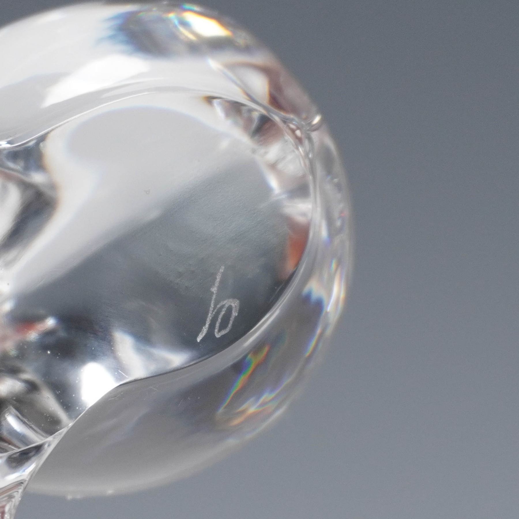 A captivating modernist glass figurine depicting a glass blower in action, crafted in clear solid glass with fluid, abstract lines. The figure is shown in a stylized pose, bent forward as if blowing into a glass bubble, which is rendered as a rounded form at the base. The smooth, flowing contours emphasize the artistry and motion of the subject. Signed on the underside with an etched mark resembling "lo" or "Jo."