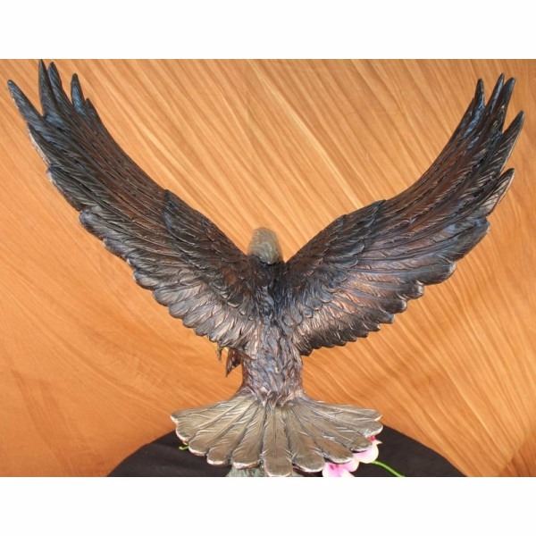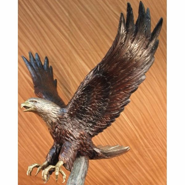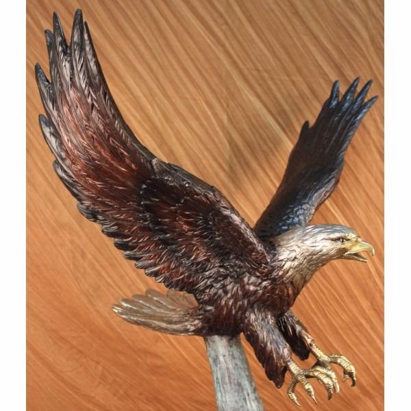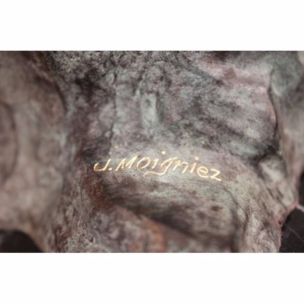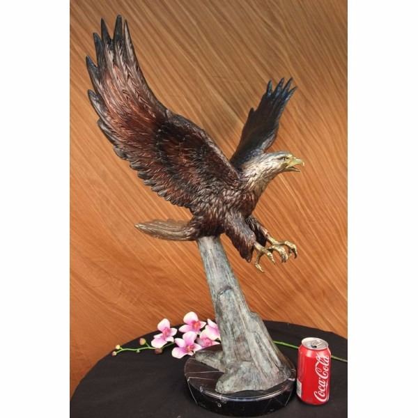 A large eagle swoops down towardsearth and prepares to pluck its meal from the ocean. Histalons are spread and hislegs are extended just waiting to grapple its prey.Eagles are known for their extremely keen eyesight, which enables them to spot potential prey from a very long distance. This keen eyesight is primarily contributed by their extremely large pupils. This carefully detailed sculpture exhibits those eyes with a menacing glare. This is a sculpture that demands attention. 100% bronze and handmade,this multicolor brown, gold. white and blackpatina sculpture was cast using the "Lost Wax Method". sealed from the European Bronze Finery and is signed J.Moigniez. Condition: This sculpture is in perfect condition. Bronze Dimensions with Marble Base:Height 30" x Width 22" Marble Dimensions: Diameter 9" Height without base: 29" Weight : 40 LBS Inventory : 40-57596M23002