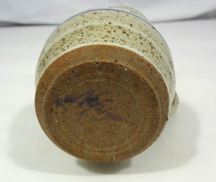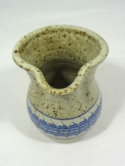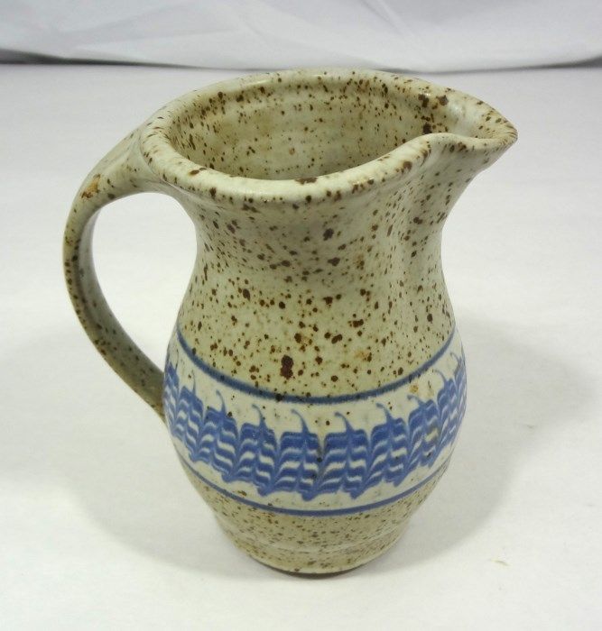 Signed Nafziger Pitcher, cream and blue with brown speckles. Pitcher measures 5 1/2" tall and 3 1/4" wide. Beautiful piece! Est Value $25.00-45.00.