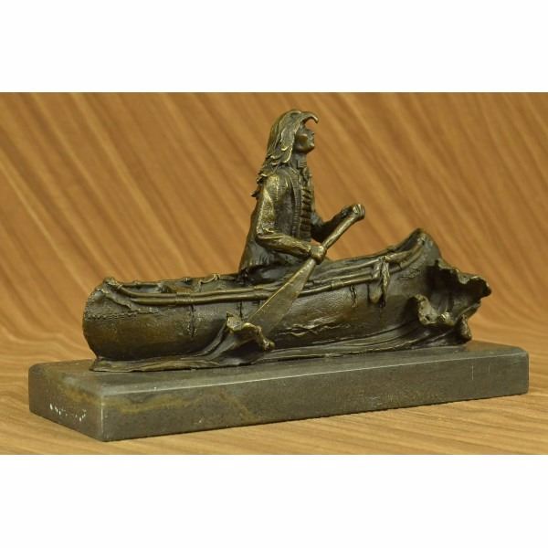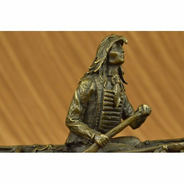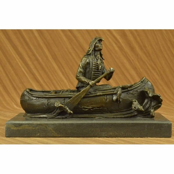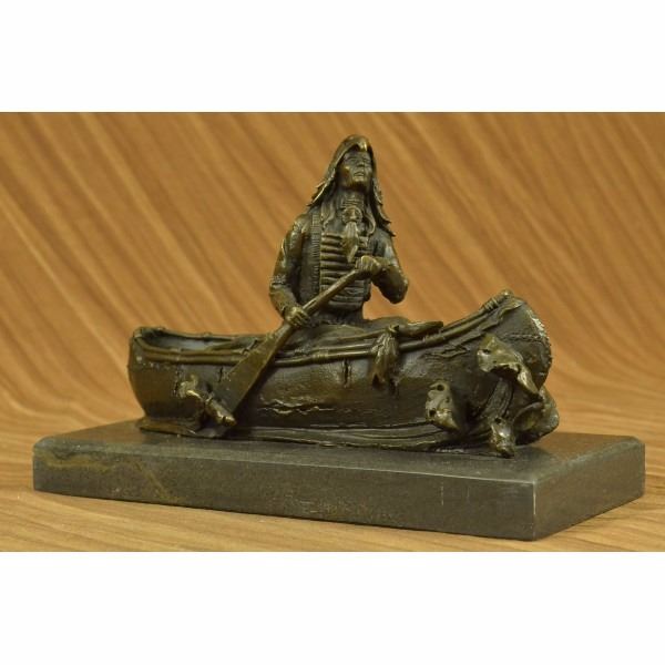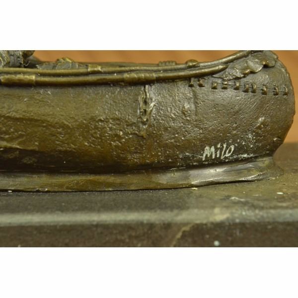 this Native American Chief embark on a treacherous mission of scouting nearby enemy territory in a birchbark canoe. Birchbark canoes are most commonly associated with Native Americans of northern New England regions, but were probably produced where ever the birch tree grew to sufficient diameter. The birch bark canoe was invented by the Eastern First Peoples. This piece is a must-have that will surely be treasured for years to come, featuring the lost wax method of casting, founded thousands of years ago ensuring an exquisitely detailed sculpture that will add grace and beauty to your business or home. Signed by artist Milo. Condition: This sculpture is in perfect condition. Bronze Dimensions with Marble Base:Height 7" x Width 10" Marble Dimensions: Diameter 10" X 4.5". Height without base: 6" Weight : 10 LBS Inventory : 26YRD11473962