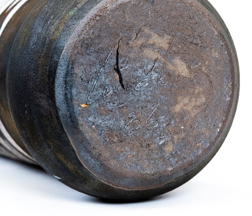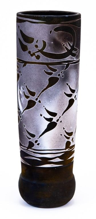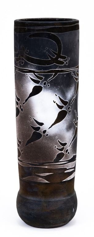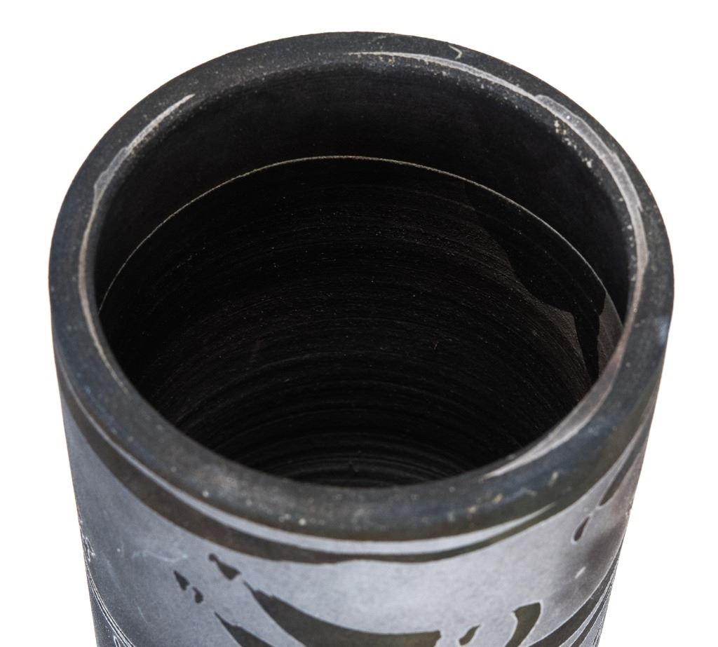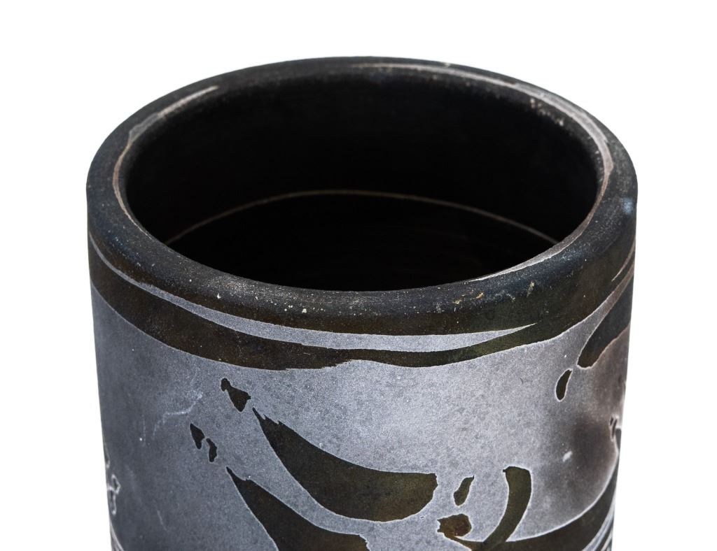 Item/Description: Tall cylindrical black vase with native marking design. Signed and dated on bottom.