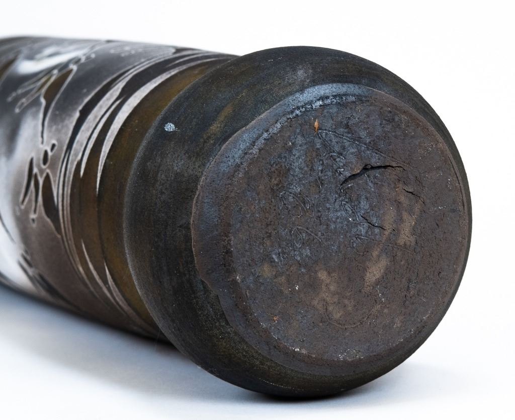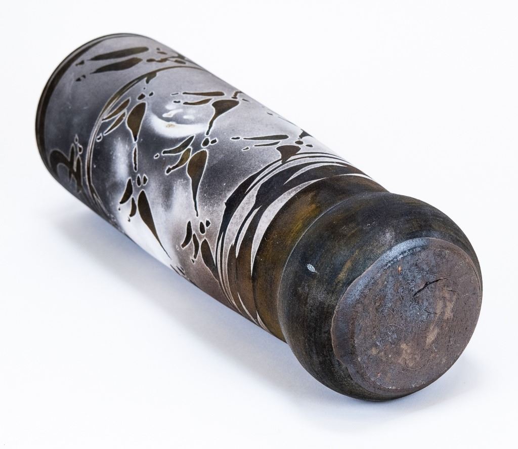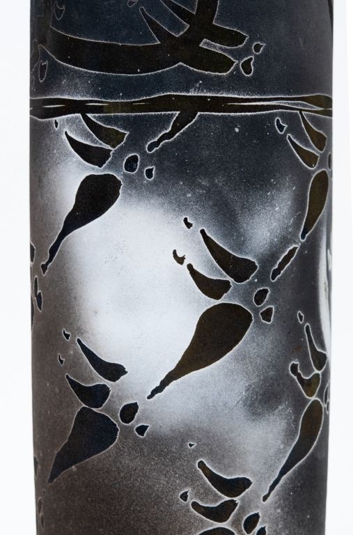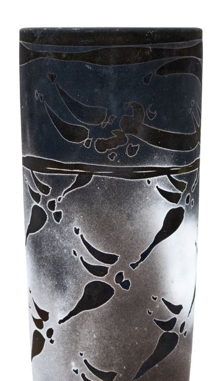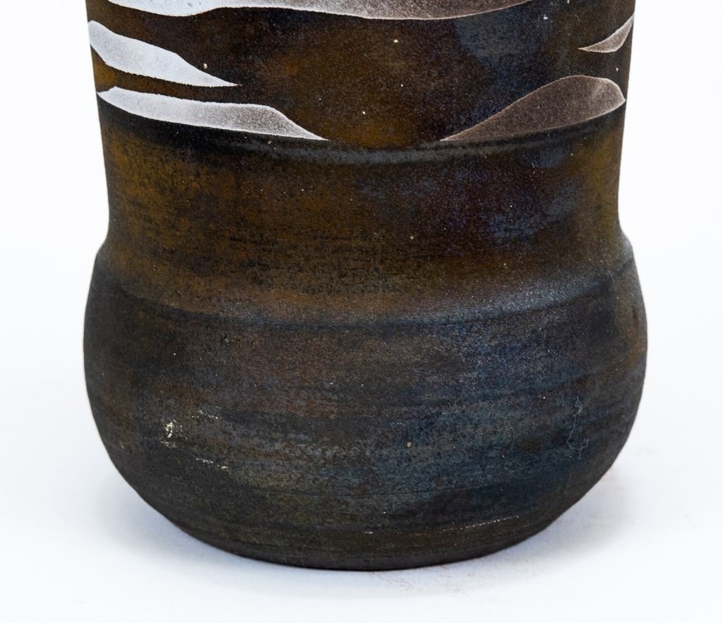 Item/Description: Tall cylindrical black vase with native marking design. Signed and dated on bottom.