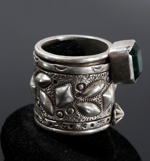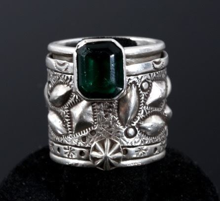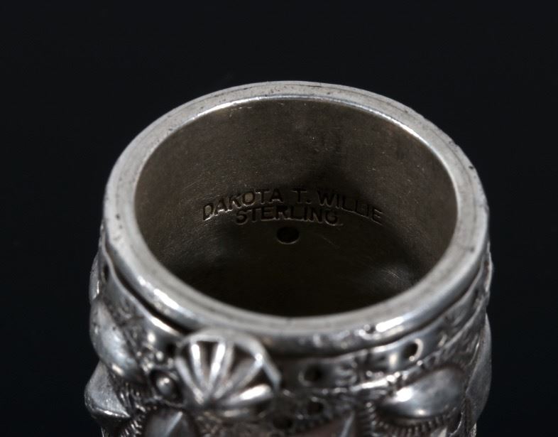Featured in this lot we have a signed Navajo Native American multi- sectional ring. The ring shows three silver moving ring sections. One of the sections shows a faux emerald with the other two rings showing silver patterns and designs. The ring is marked "Dakota T. Willie Sterling" on the inside of the ring. The piece shows good condition overall with some light wear. The ring is fitted for a U.S size 11.