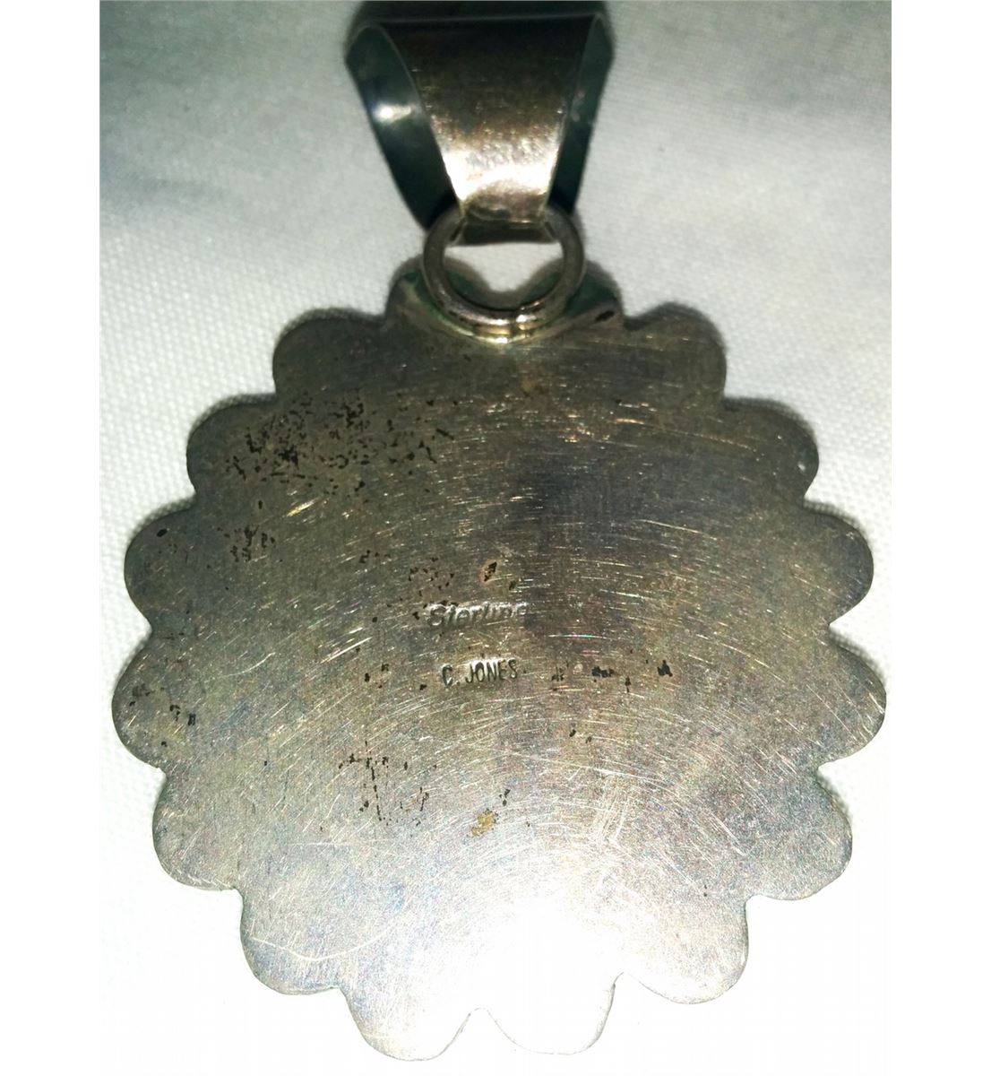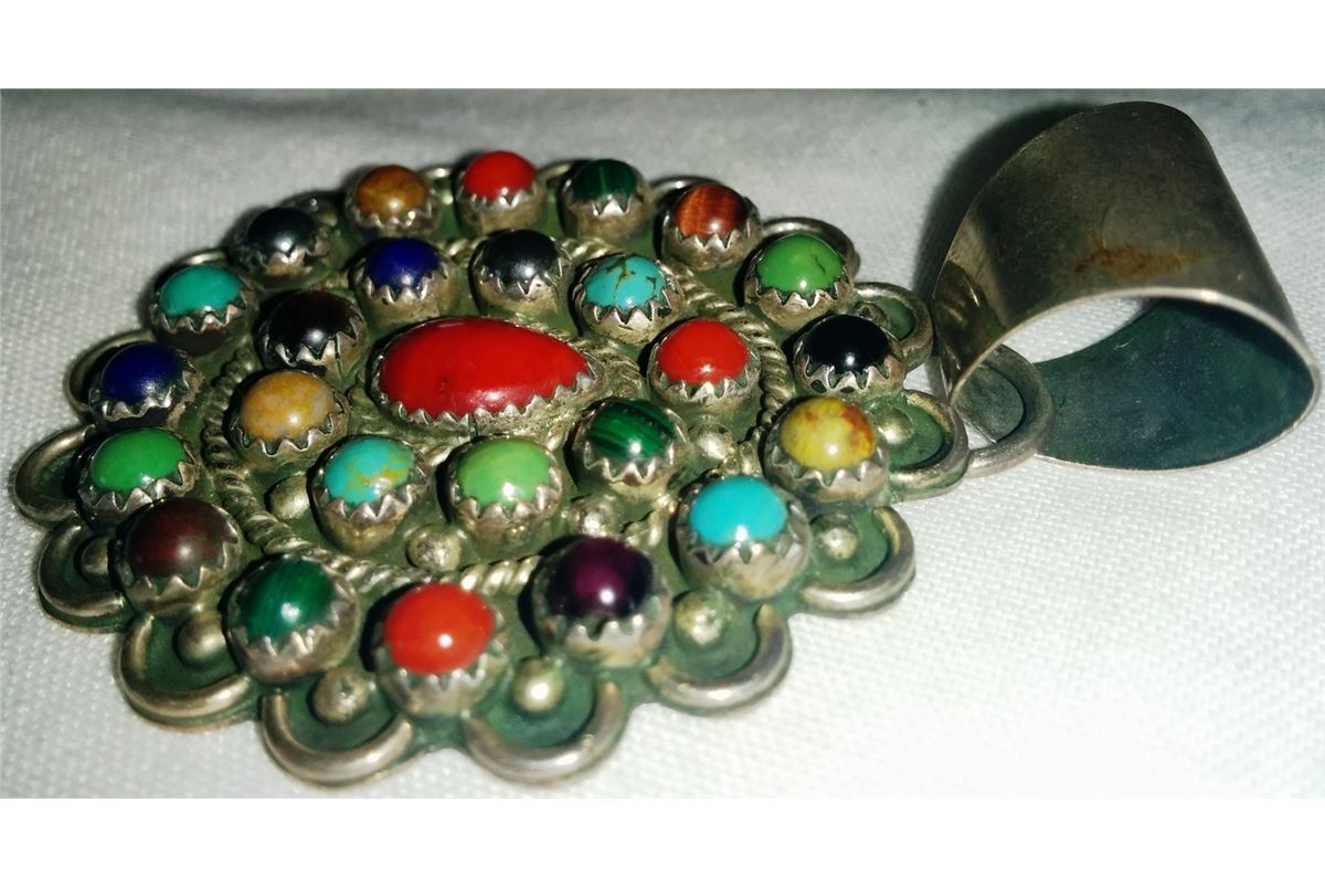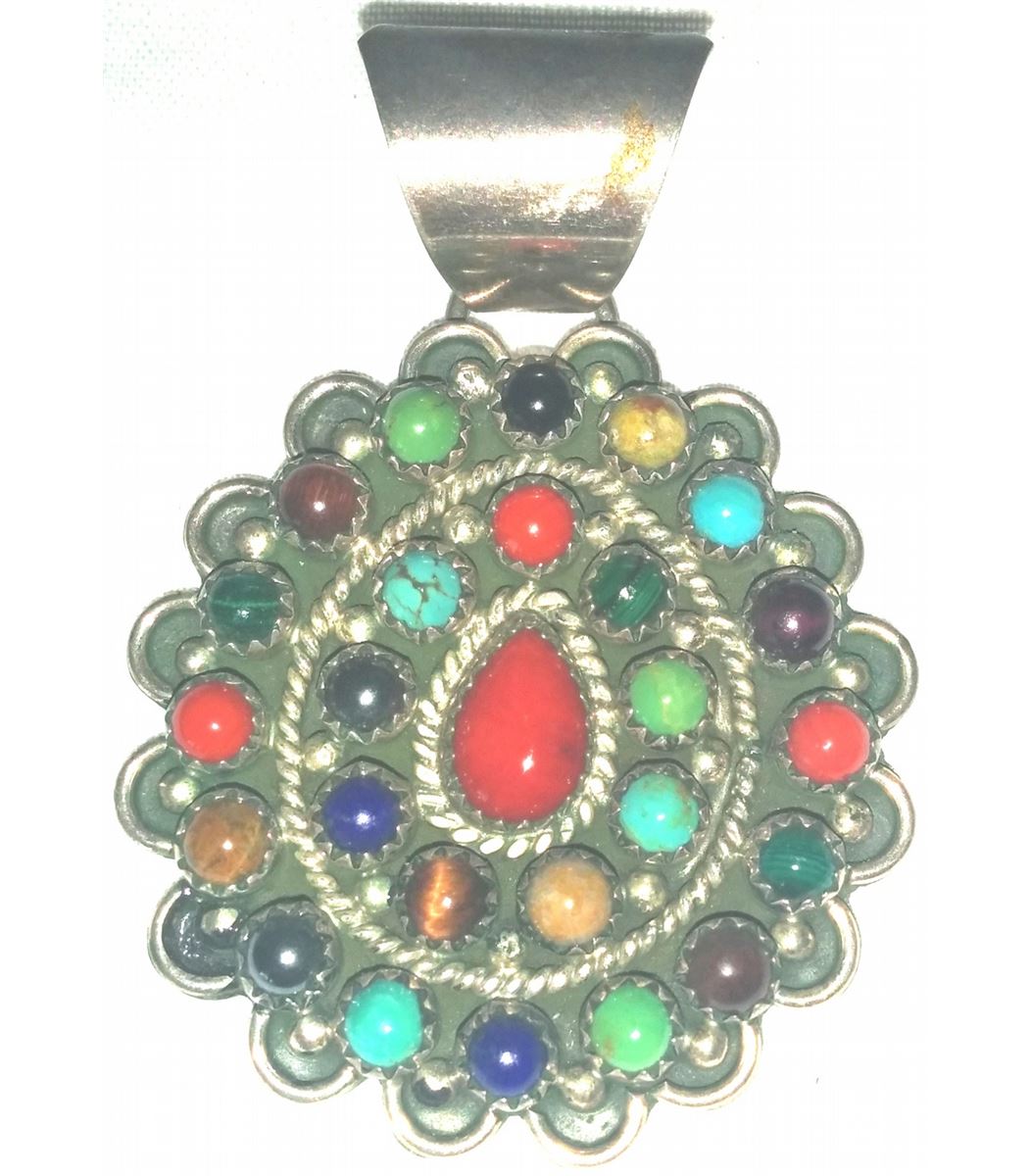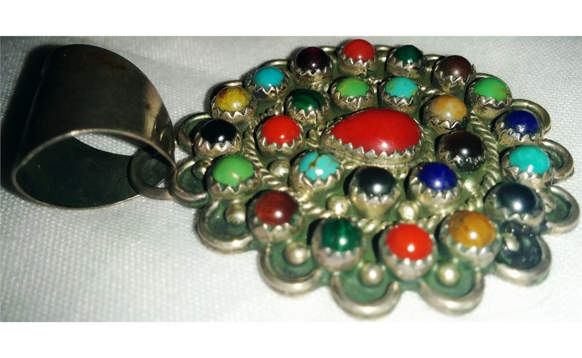 Navajo Multi-Stone pendant made of sterling silver. The item is signed. It has many stones to include coral and turquoise. The item measures approx. 1 1/2" x 1 1/2" and weighs approx. 20 grams. Condition: Good condition, see images. Shipping: $14.50.