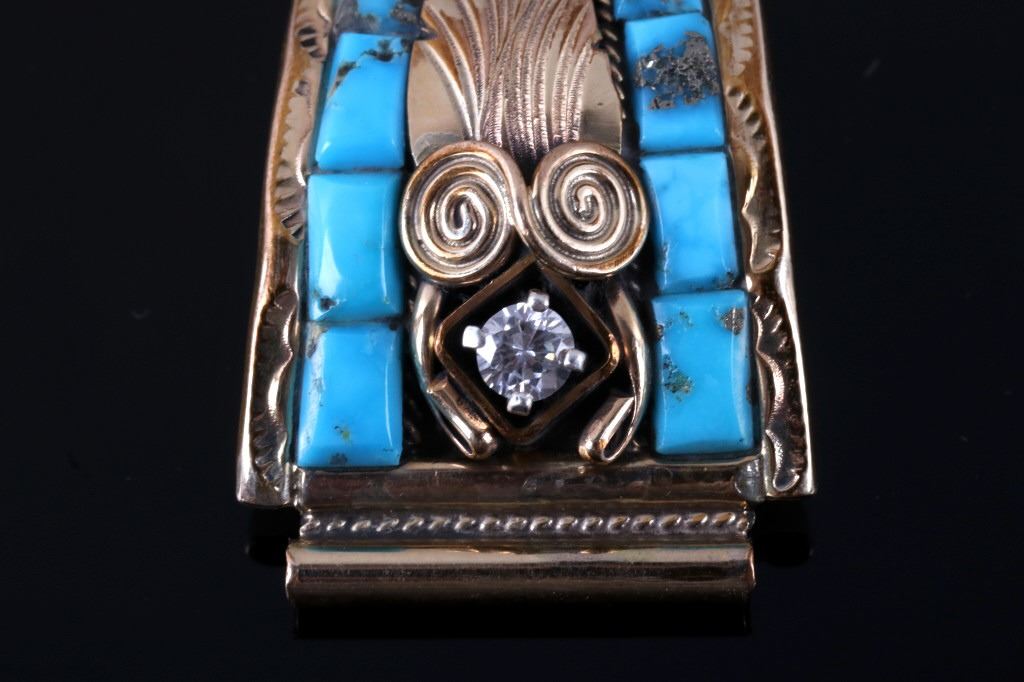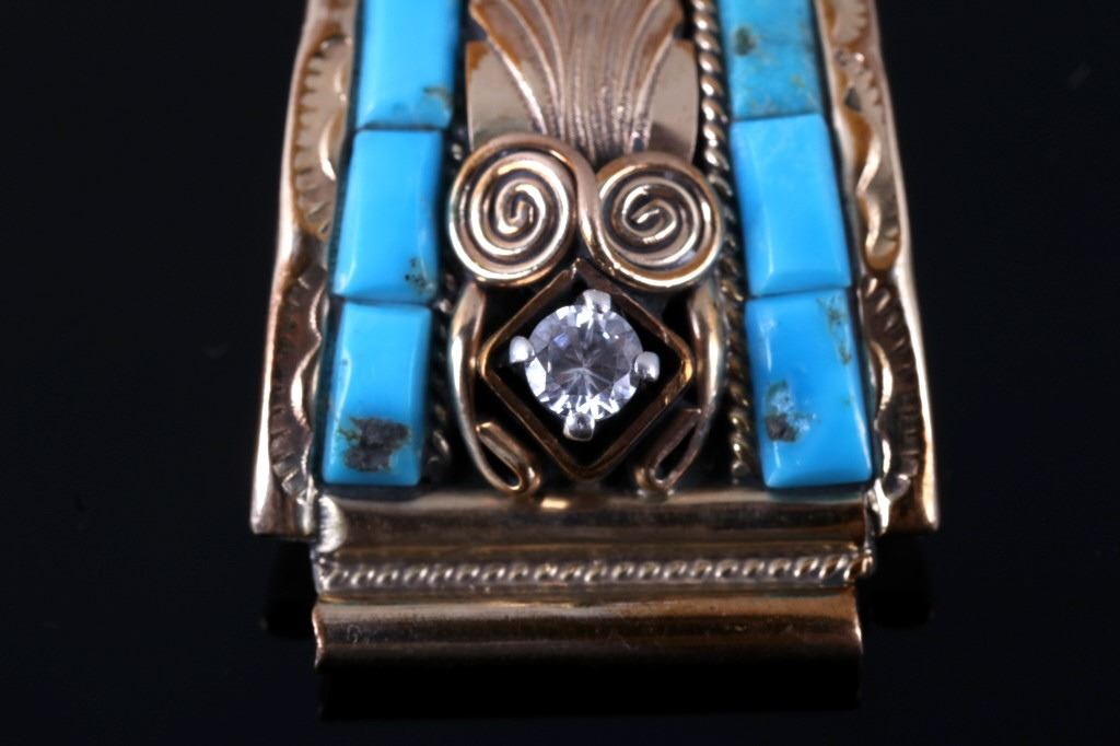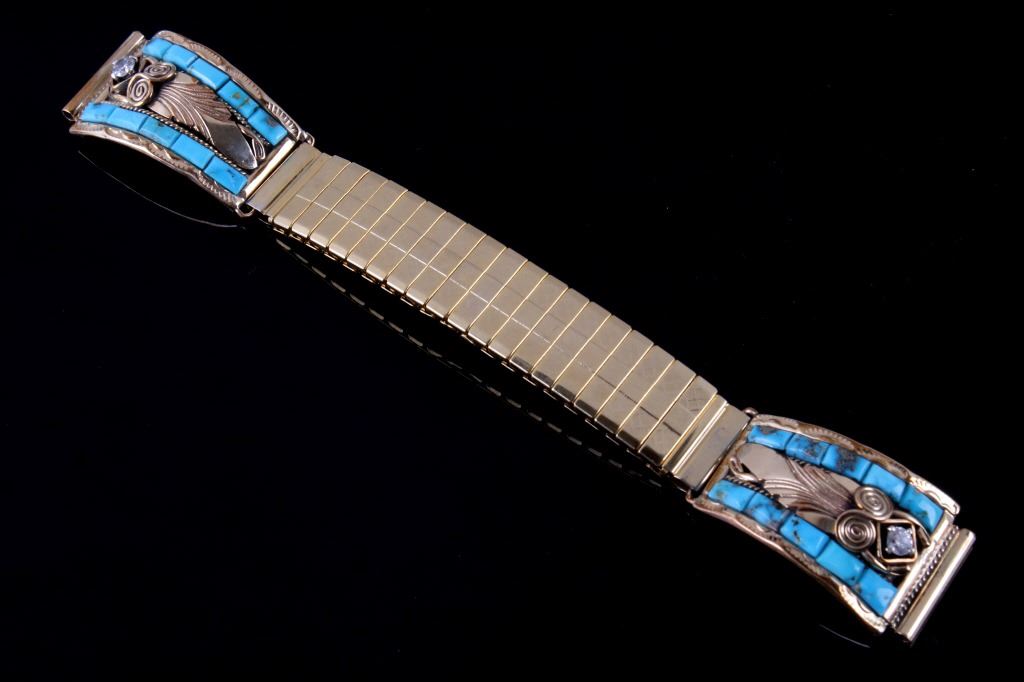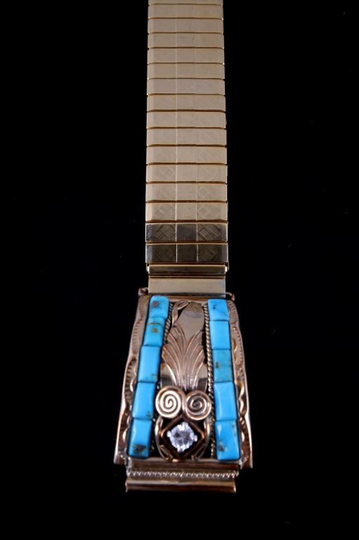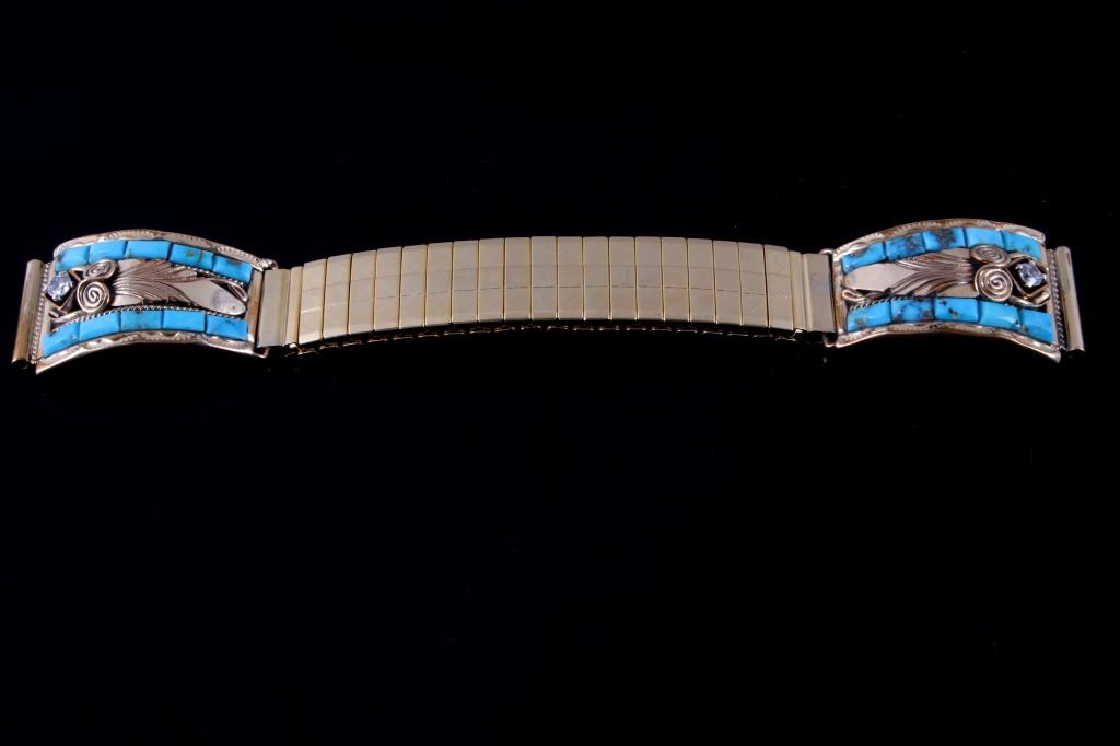 For your consideration is this Navajo sterling silver and Morenci turquoise watch band signed by S. Roy a Navajo artist. The watch band connecting pieces are signed by Navajo artist S. Roy and include twenty square pieces of Morenci Turquoise and two unidentified faceted stones. The watch band is 14k gold washed sterling silver out of Hong Kong and is marked Hong Kong on the bottom of the stretch silver band. This is a really nice piece with good attention to detail and craftsmanship. The measurements of this watch band are 6 1/2" x 1" and the weight of this watch band is 35.2g.