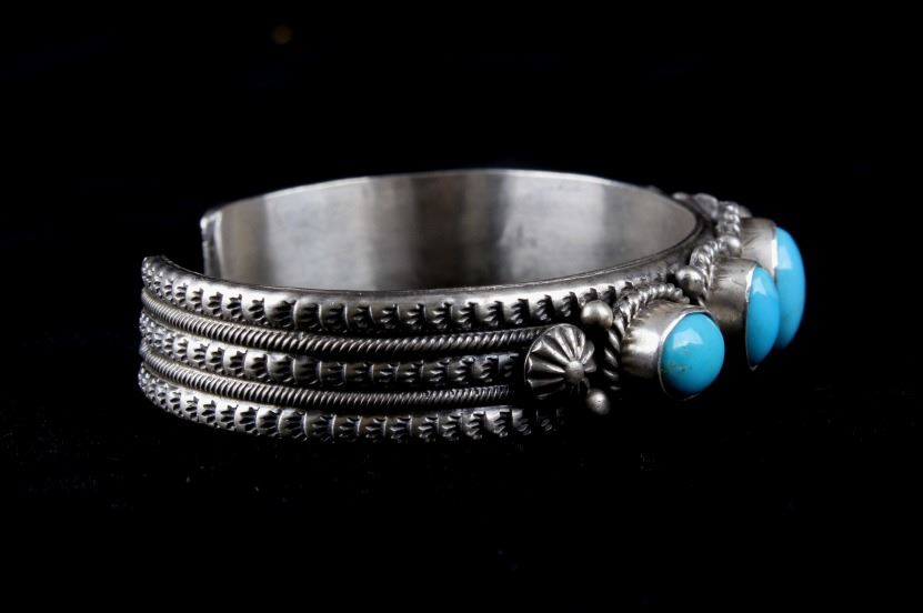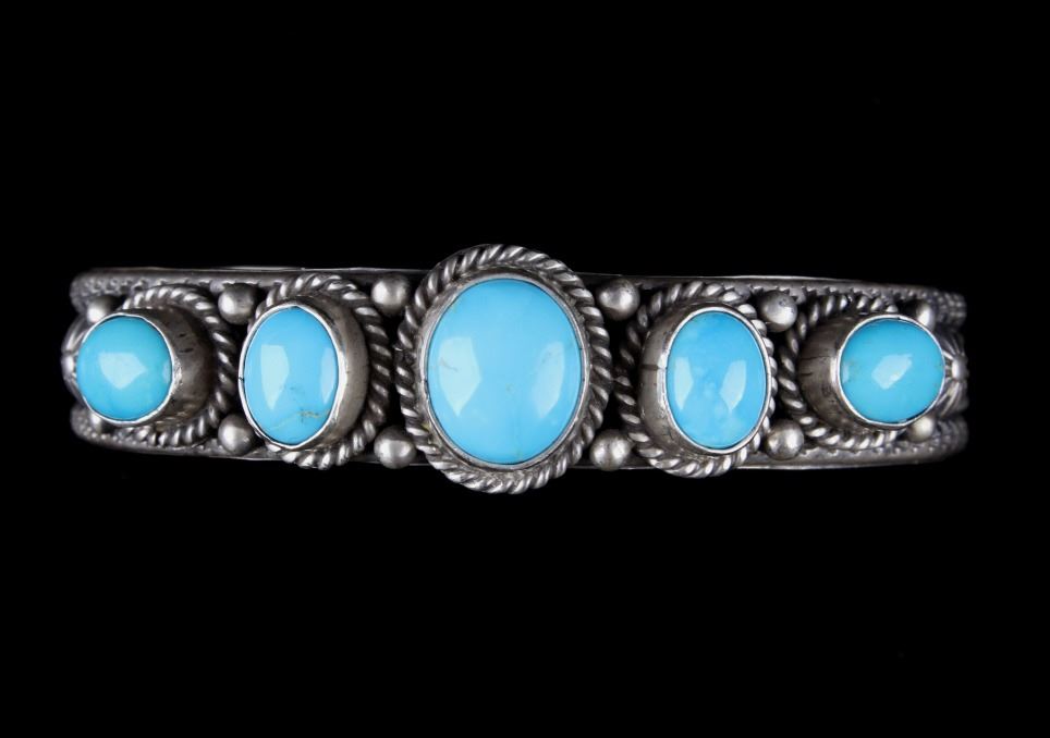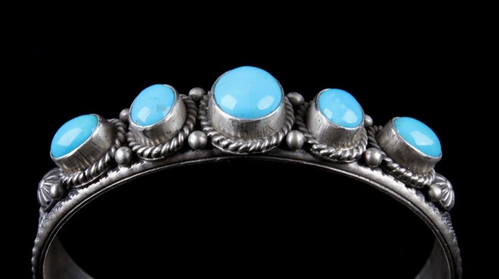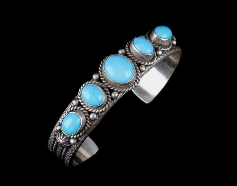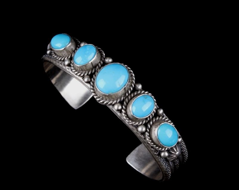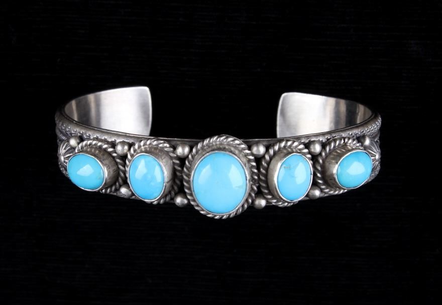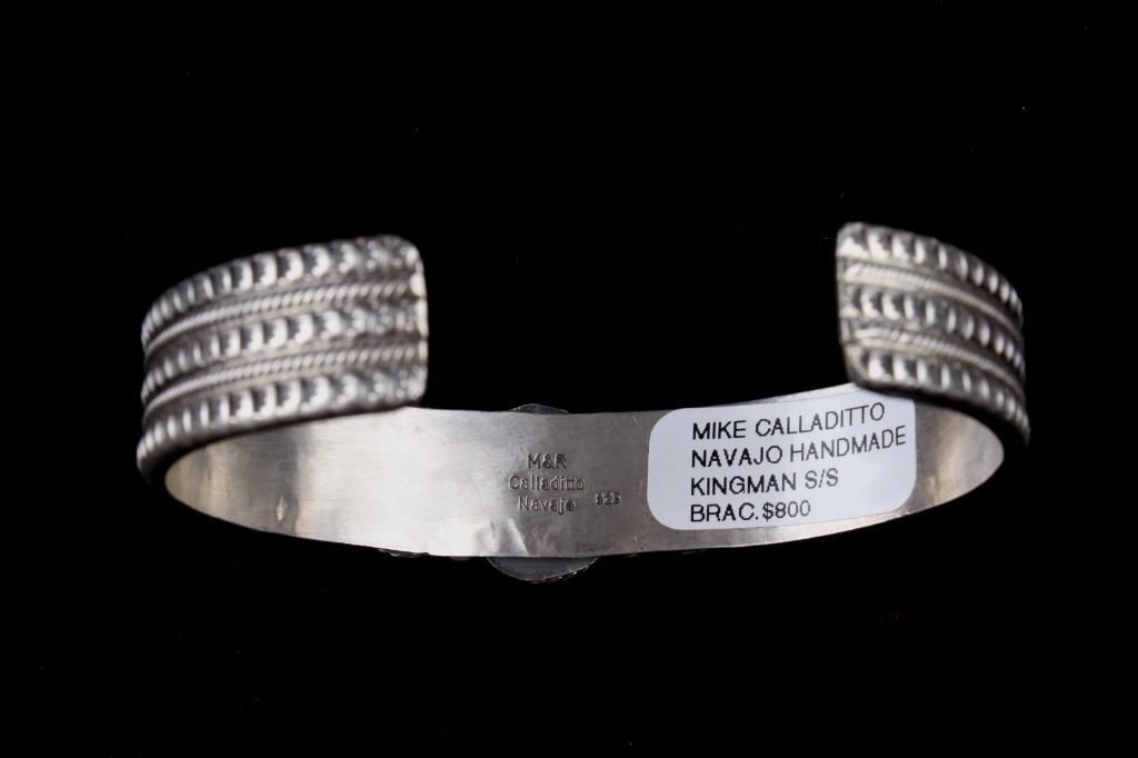 For your bidding pleasure is a Navajo Native American sterling silver and Kingman turquoise cuff. This is a beautifully hand crafted piece made by expert silversmith Mike Calladitto. This cuff features five Kingman turquoise cabochons graduated in size with the largest at the forefront. The sterling has been tooled with a detailed design and each cabachon is surrounded with a bead and braided rope. The band of the bracelet is made of sterling silver and is signed by the artist "M&R Calladitto" and stamped Navajo .925. The interior circumference measures 5 1/2".