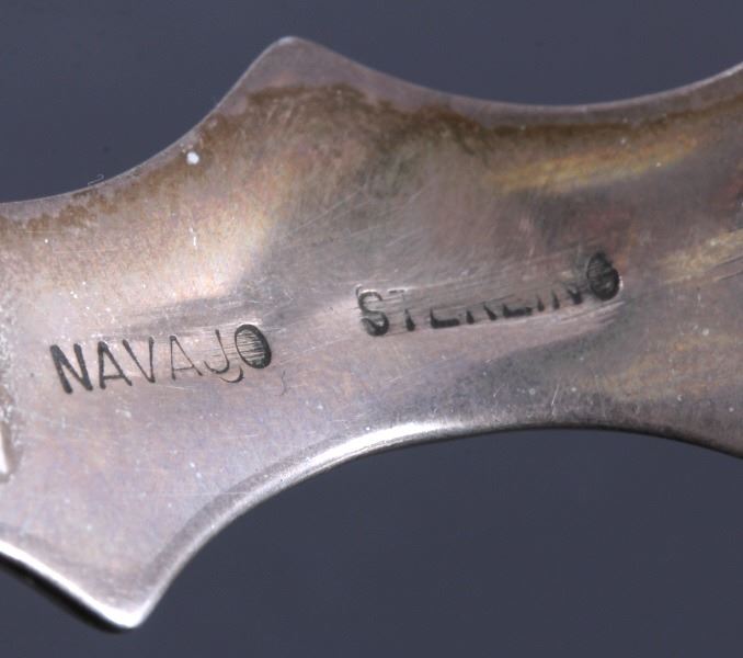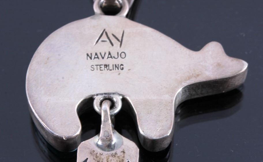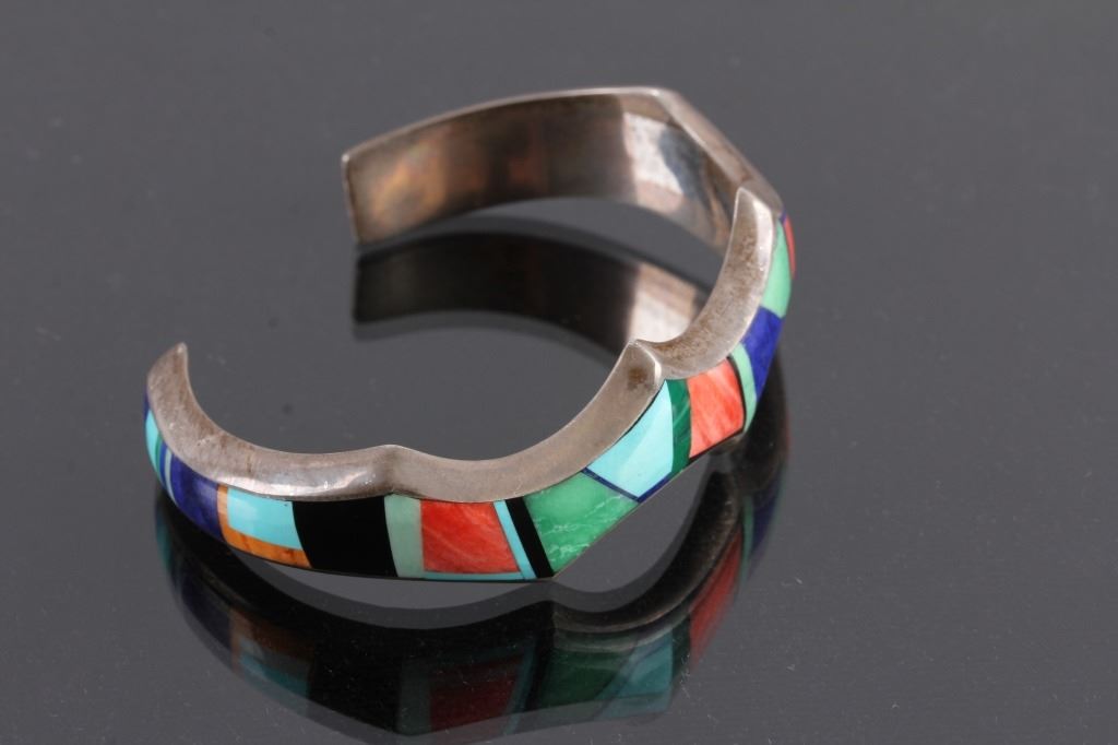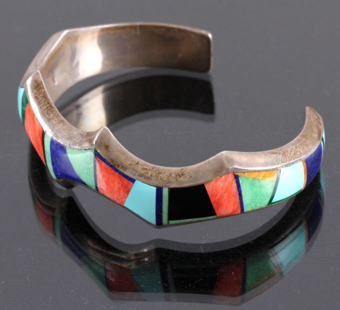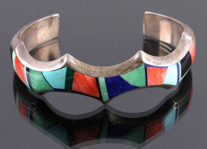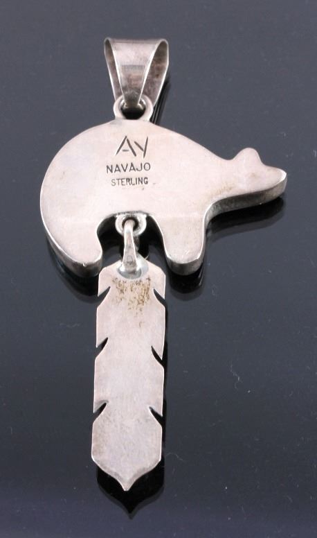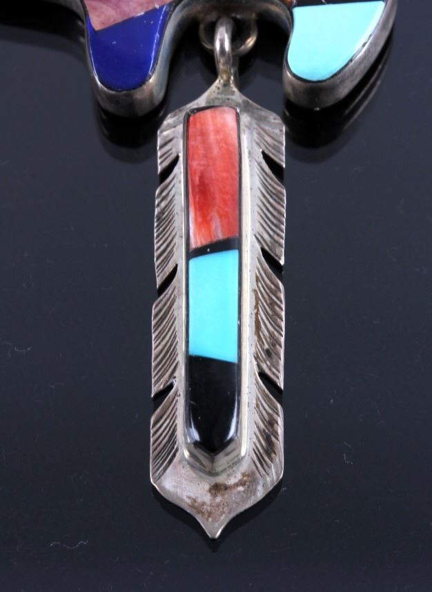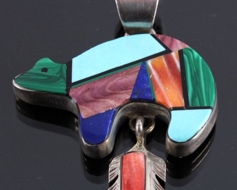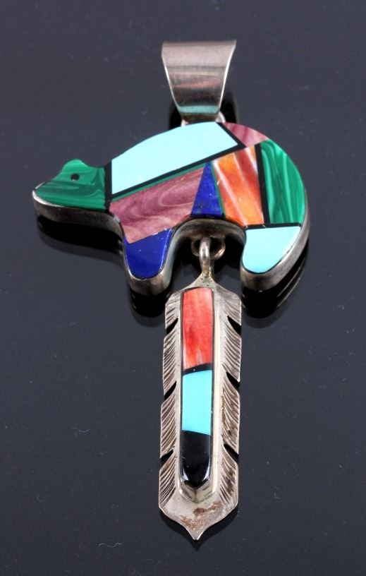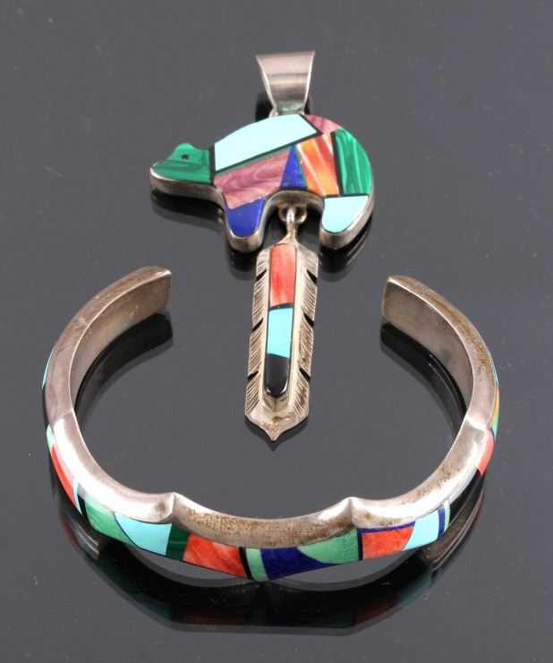 This is a signed Navajo Native American Indian sterling silver bracelet and pendant made by Frank Yazzie. Both pieces show a wonderful mosaic design with inlaid turquoise, malachite, coral, lapis, onyx and more. The back of each piece is marked "Navajo Sterling" and is signed "FY" (Frank Yazzie). The Navajo bracelet and pendant are in good condition. The bracelet measures 2" x 2.5" and the pendant is 1.375" x 2.75".