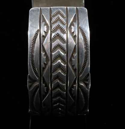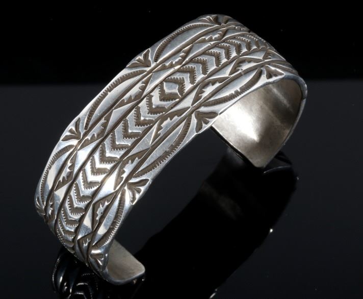 Featured in this lot we have a signed sterling silver carved bracelet. The cuff is constructed out of sterling silver with carved geometric patterns across the face of the piece. The bracelet is marked on the back reading "R E - Sterling". R E is the hallmark for Silver crafter Rick Enriquez. The piece is in good condition and shows a warm silver patina. The bracelet measures 1" wide with the inside circumference of the cuff measures 2 1/2". Weighs 65.3 Ounces.