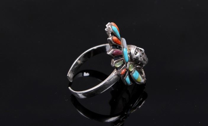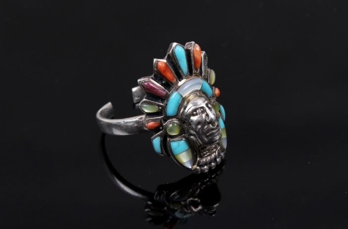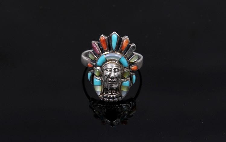 Offered for your bidding pleasure is a signed Navajo Native American Sterling Silver Multi Stone Headdress ring. This beautiful ring depicts a Native American chief with a vibrant headdress. This unique piece shows Sleeping Beauty Turquoise, Coral, Mother of Pearl, and Serpentine polished stones. The ring is signed and is also stamped Sterling. This ring is in good condition with only one stone missing. The size on this ring is adjustable.