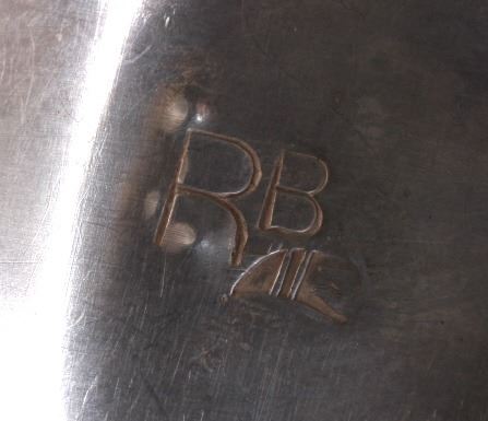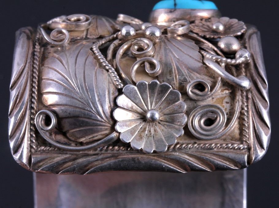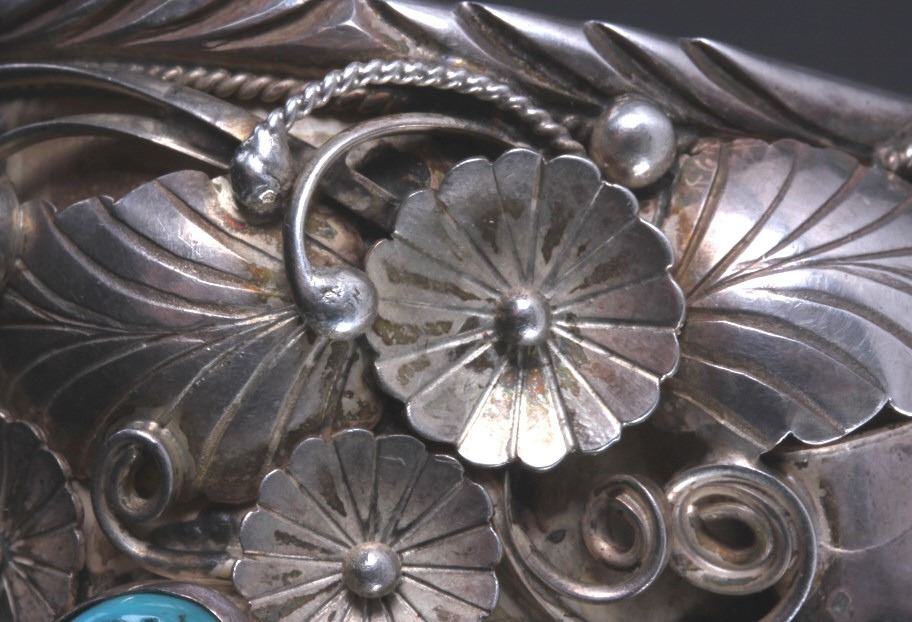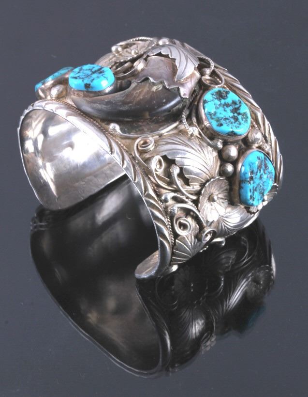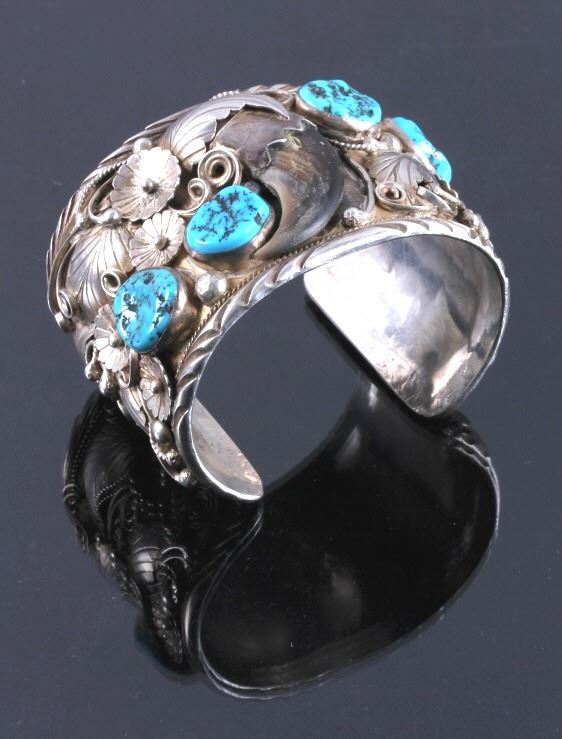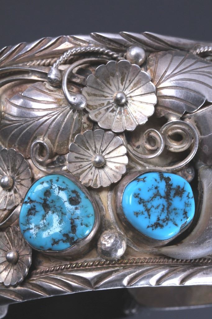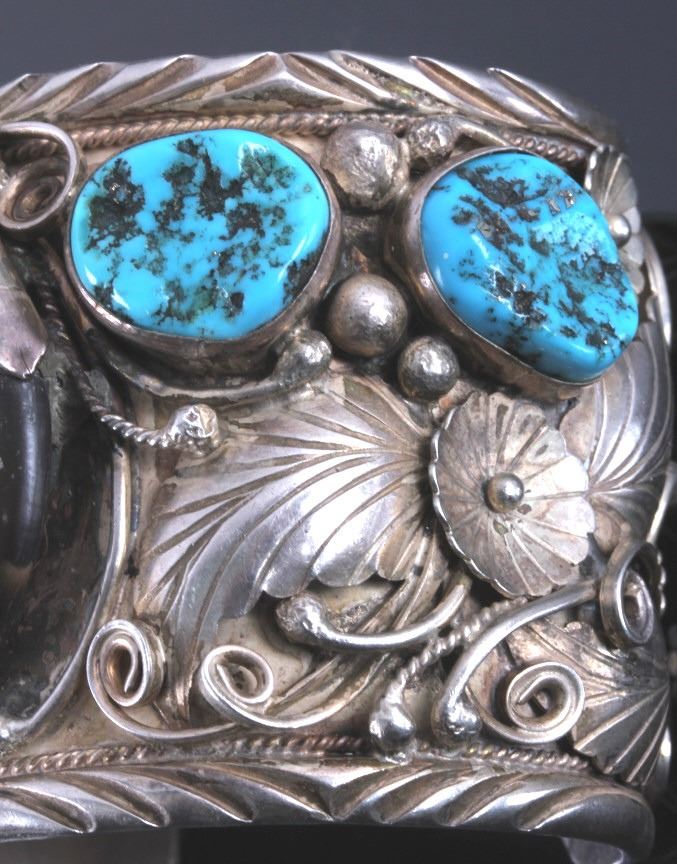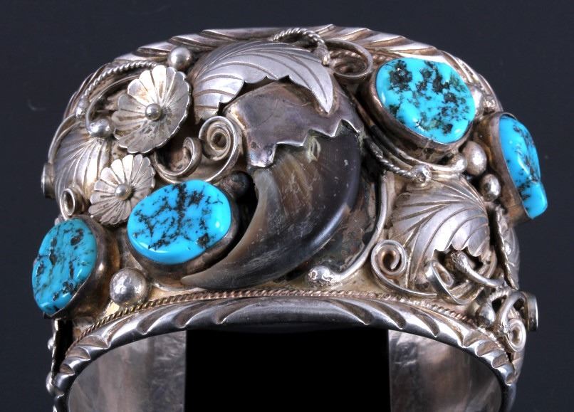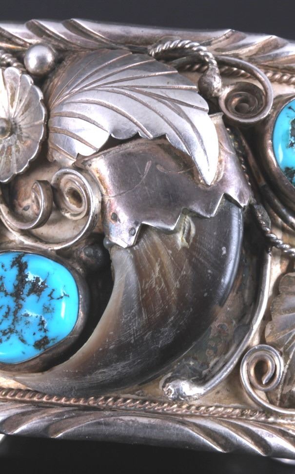 This is a Navajo sterling silver with turquoise and bear claw cuff. The piece was made by Richard Begay and is signed on the back. The cuff features a bear claw surrounded by four Sleeping Beauty Turquoise stones set in sterling silver. The cuff also shows wonderfully worked flowers, leaves and scrollwork. The Navajo cuff is in good condition. It measures 2" x 3" and is 2" wide.