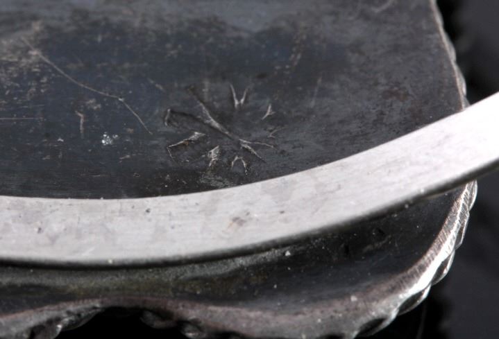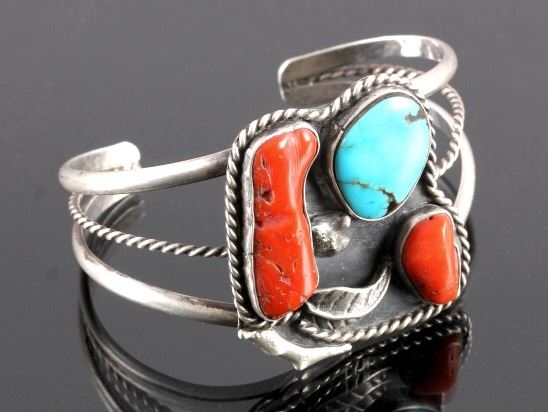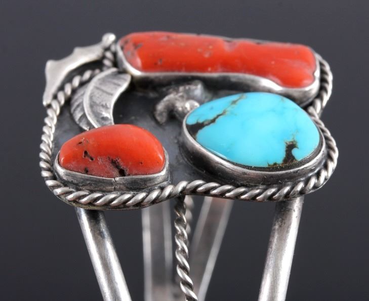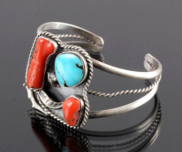 This is a signed Navajo Native American Indian sterling silver with turquoise and coral cuff. The piece is beautifully crafted from solid sterling silver and features a wonderful display of three turquoise and coral cabochons accented by the twisted rope border and feather. The back of the cuff shows the maker's mark stamped as shown. The Navajo cuff is in good condition. It measures 2" x 2.25" and is 1.5" wide.