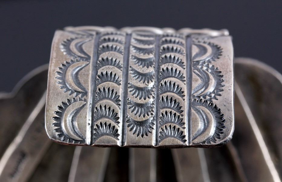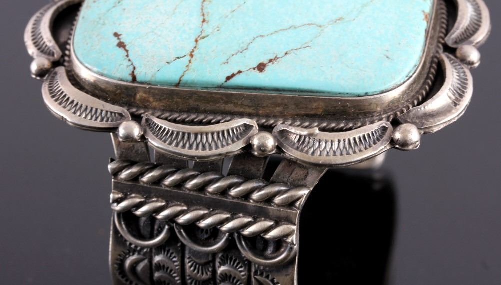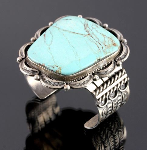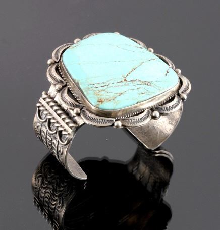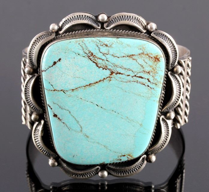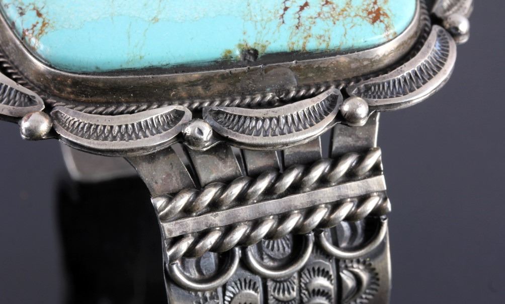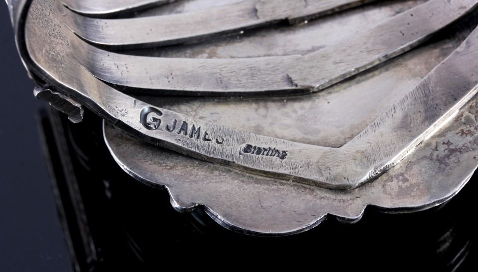 This is a signed Navajo Native American Indian sterling silver and turquoise cuff. The cuff is made from solid sterling silver and features a large turquoise cabochon set in the center framed by a hand stamped bezel. The band shows more hand stamped accents as well. The back of the cuff is marked "Sterling" and is signed "G. James". The Navajo cuff is in good condition. It measures 2" x 2.75" and is 2.5" wide.