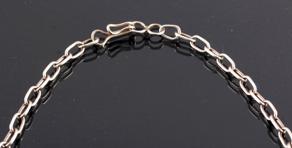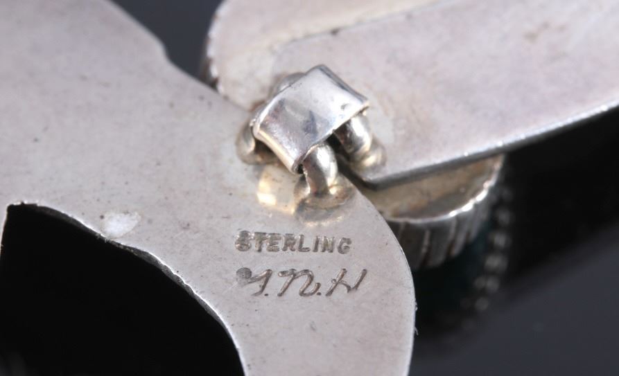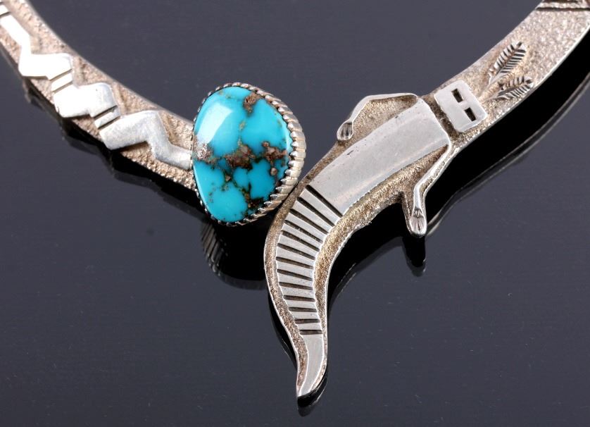 This is a Navajo Native American Indian sterling silver and turquoise gorget necklace. The necklace shows a wonderful Yei character with a stunning Morenci Turquoise cabochon. The back of the piece is marked sterling and is signed "G.N.H" (George & Nusie Henry). The Navajo necklace is in good condition. It measures 15.5" long.