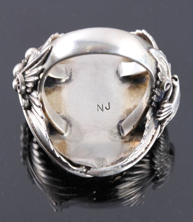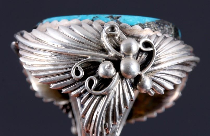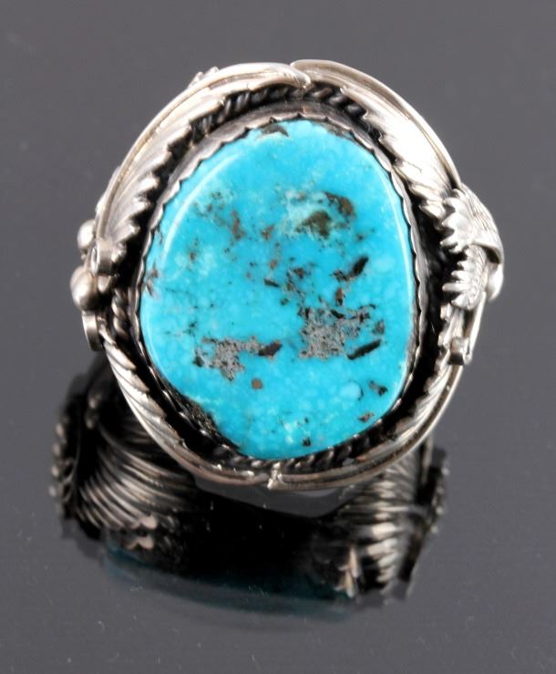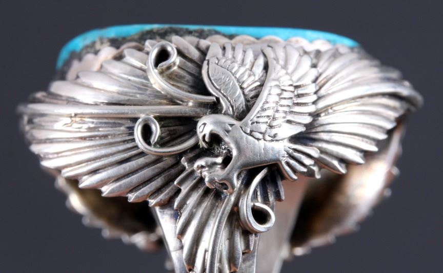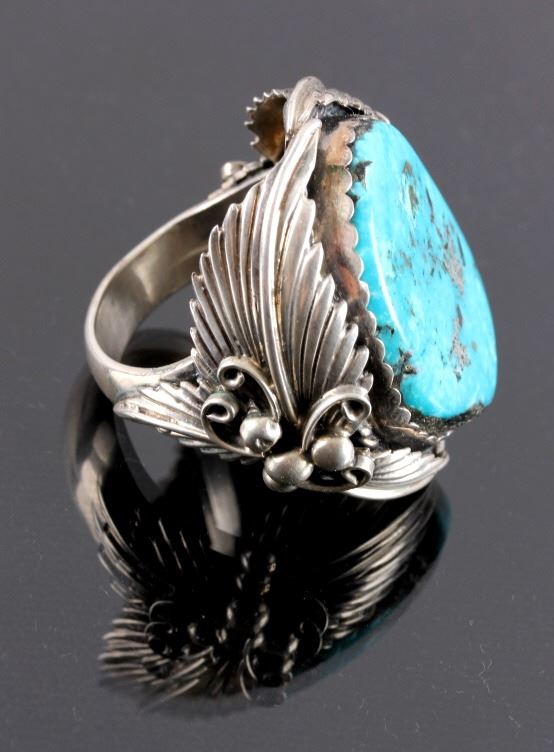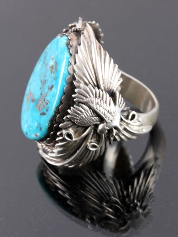 This is a Navajo Native American Indian signed sterling silver and turquoise ring made by Nila Cook Johnson. The ring features a large Pilot Mountain Turquoise cabochon with appliqued accents on each. The turquoise shows a rich blue color with a silvery metallic matrix One side shows a finely detailed eagle in flight. The back of the ring is signed "NJ" (Nila Cook Johnson). The Navajo turquoise ring is in good condition. It is size 11.