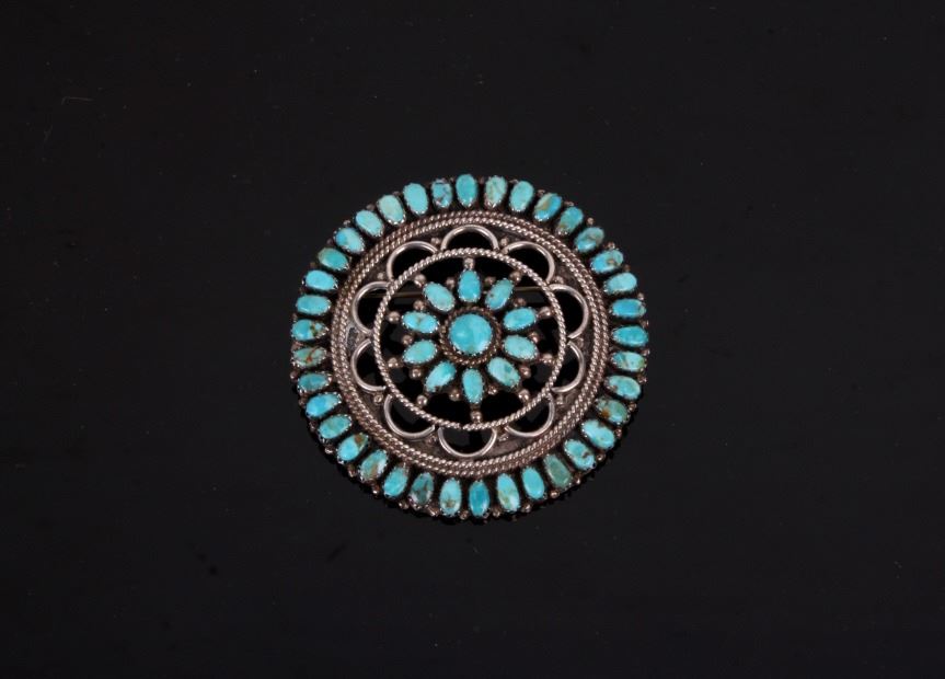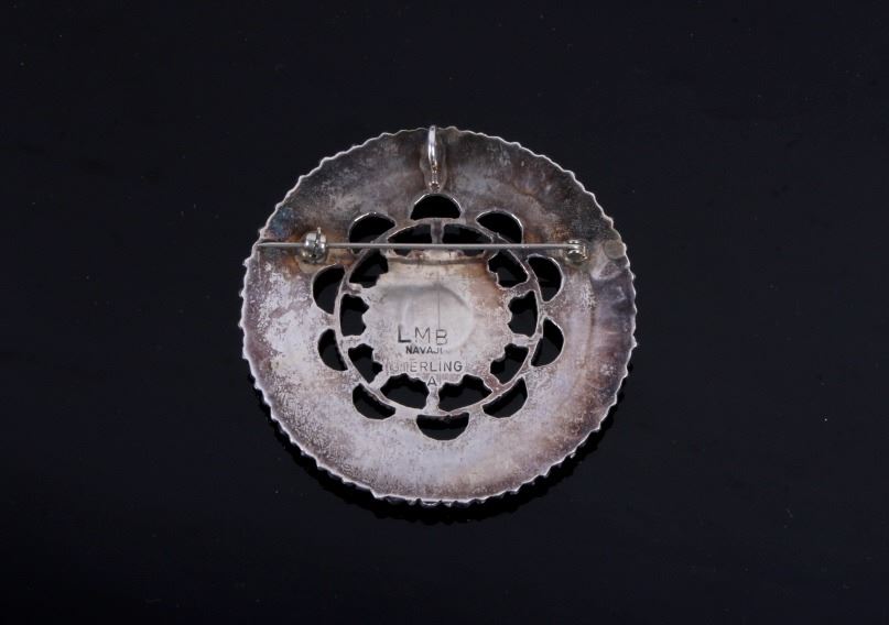 Offered for your bidding pleasure is this Signed Navajo Native American Sterling Silver and Sleeping Beauty Turquoise brooch. The piece features 37 polished sleeping beauty stones on the outside circumference of the brooch. Each turquoise stone is offset by a polished silver bead. The inside to the brooch features 11 turquoise stones. The brooch is signed "LMB Navajo Sterling". "LMB" refers to Navajo artist Larry Moses Begay. The back of the brooch features a standard brooch pin as well as a hook to add a chain to use as a necklace. This piece shows good condition and measures 2 1/2" in diameter.