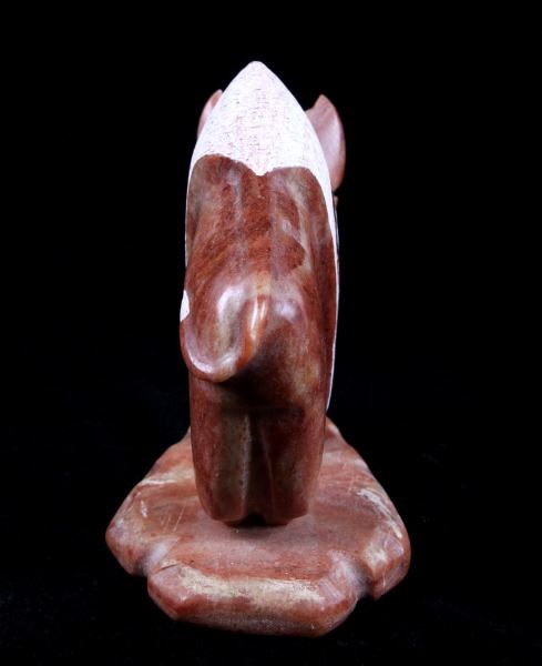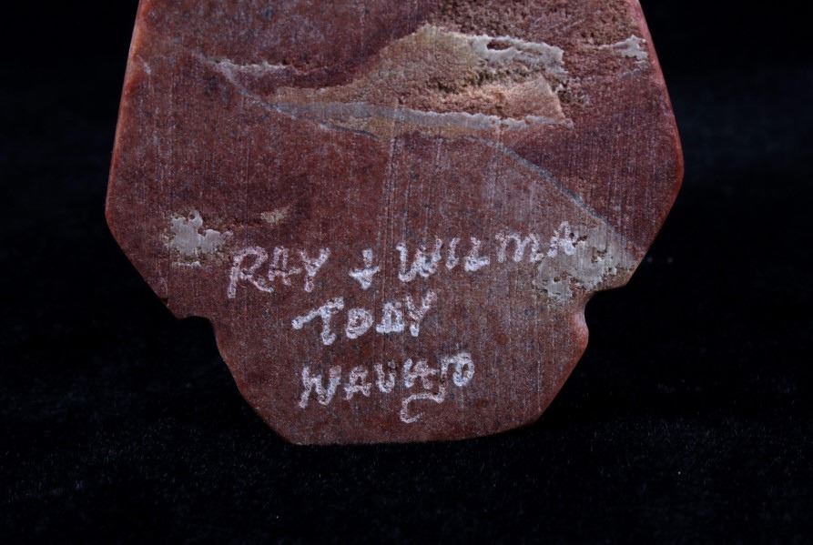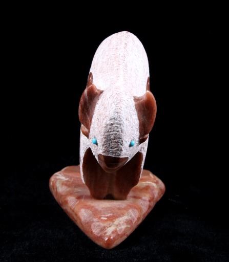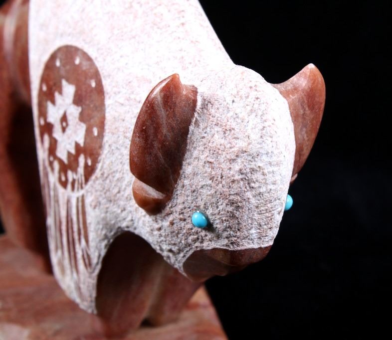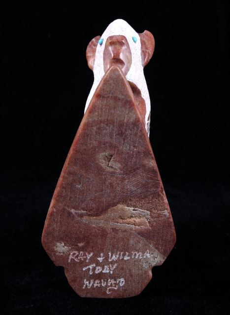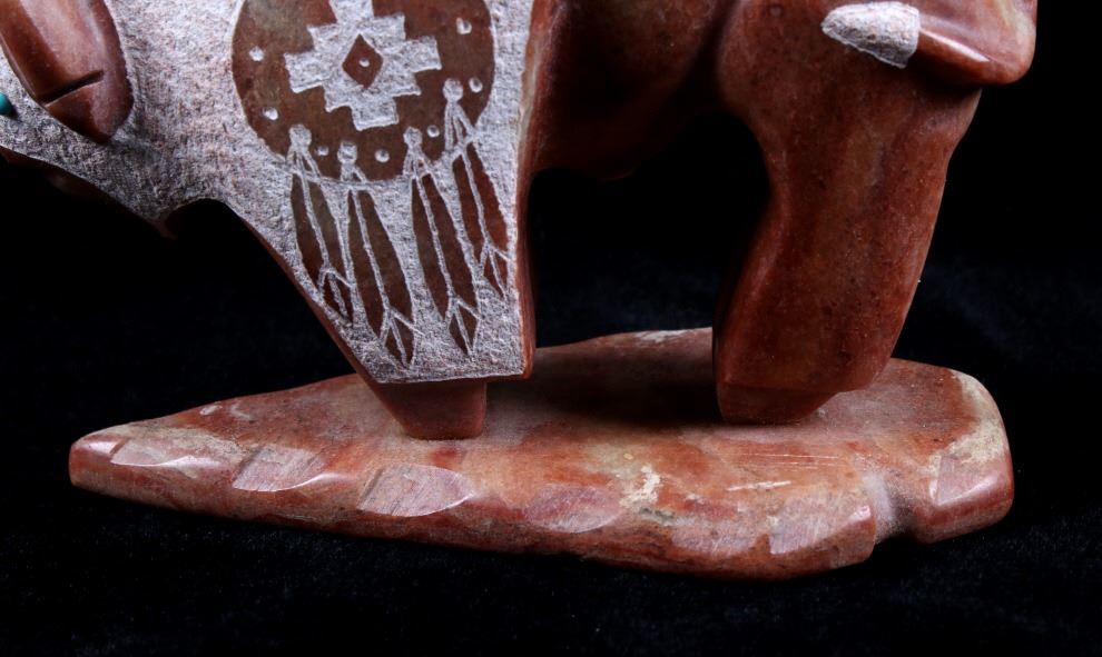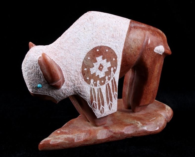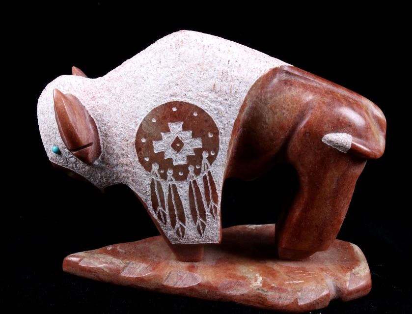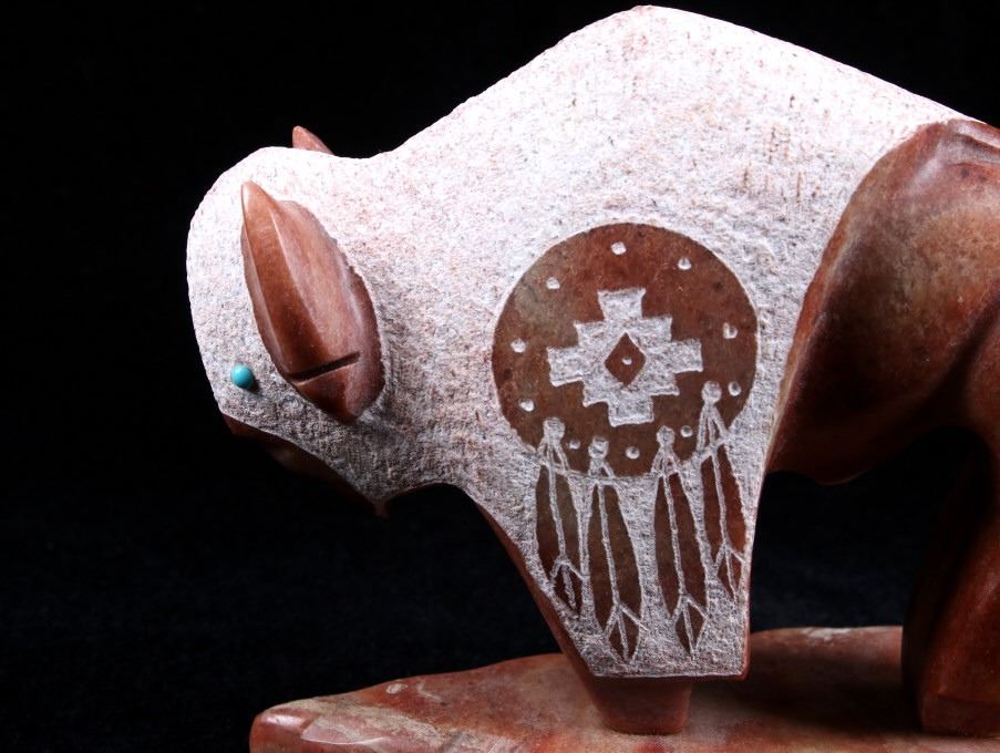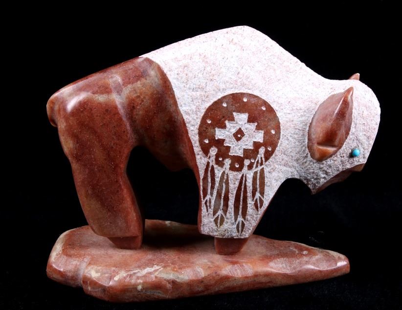 Offered in this lot we have a signed Navajo hand carved stone buffalo sculpture. The piece shows a stone buffalo standing on a carved arrowhead. The buffalo shows hand carved designs with polished and rough style. Each side of the piece shows a warrior shield design with feather tassels and turquoise eyes. The piece shows wonderful art style and design. The bottom of the arrowhead is marked "Ray + Wilma Toay Navajo". The sculpture shows good condition overall. The piece measures 5 1/4" long by 2 3/4" wide and 4 1/4" tall.