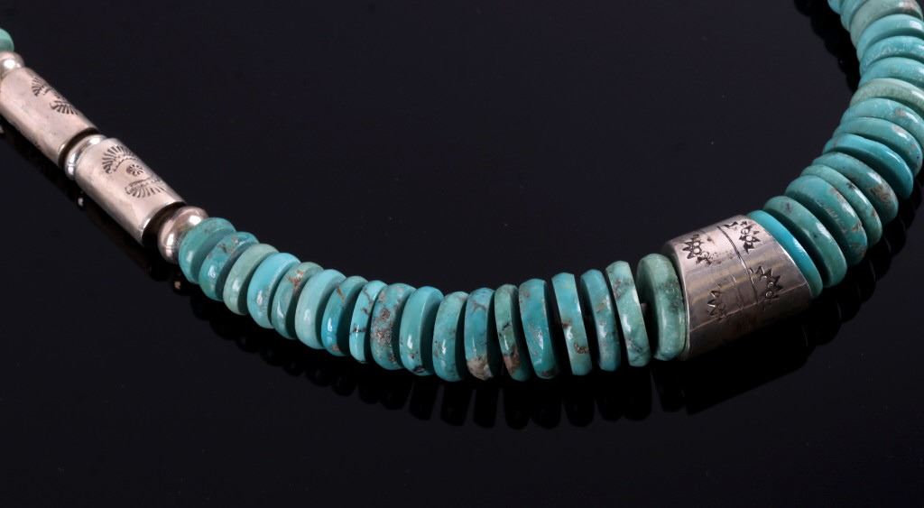 For your consideration is a signed Navajo Turquoise Mountain Discoidal necklace. This signed piece of Navajo jewelry features 5 sterling silver decorated beads. The large center silver peice is signed by the artist N.P. Cortiz and stamped sterling. The discoidal turquoise gems are from the Turquise Mountain mine and have hesche shells seperating them. The necklace measures 29 3/4" and is one inch thick at the middle. The silver has a light patina and is in overall good condition.