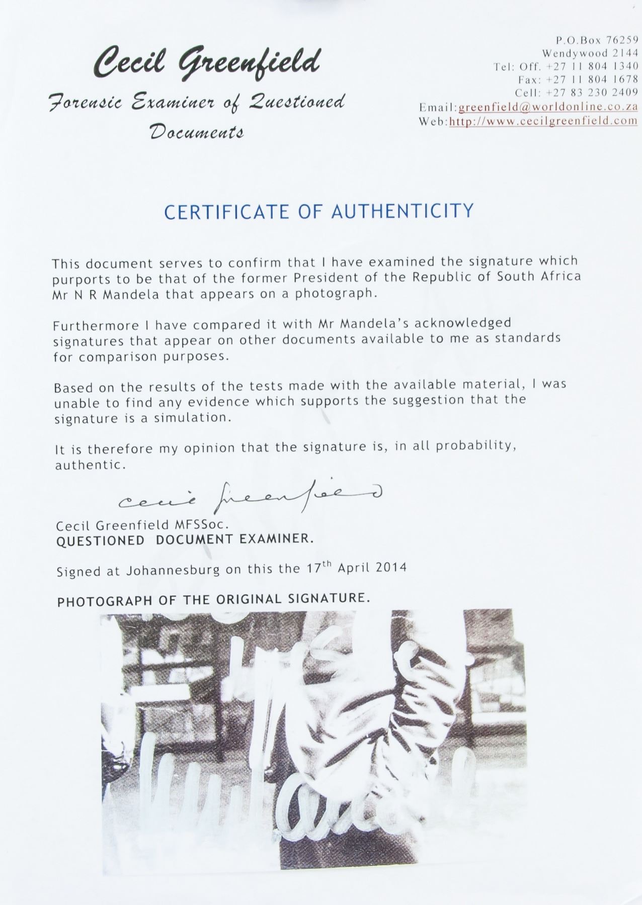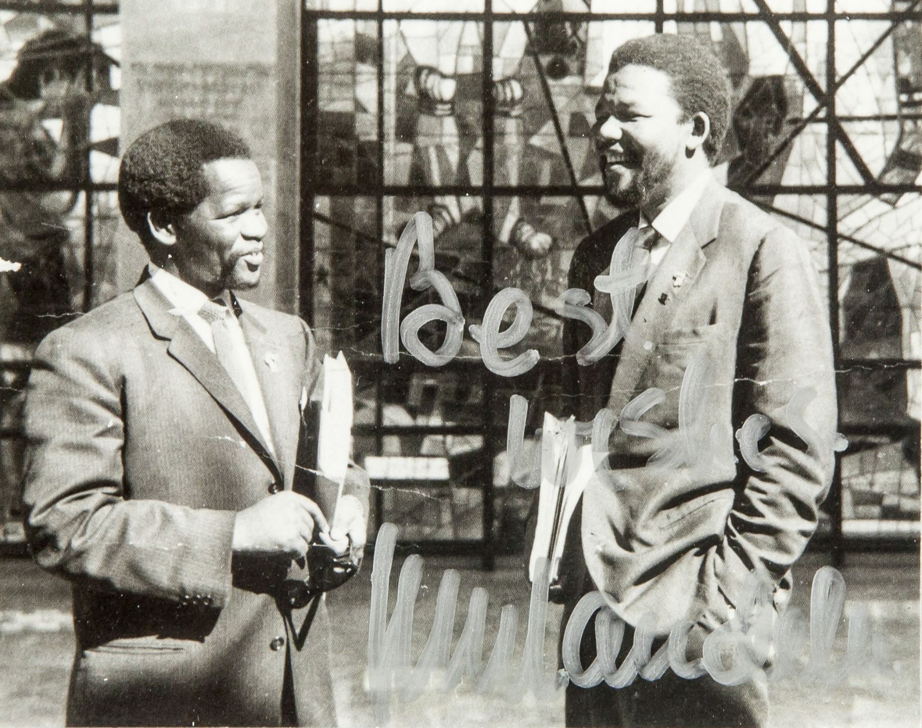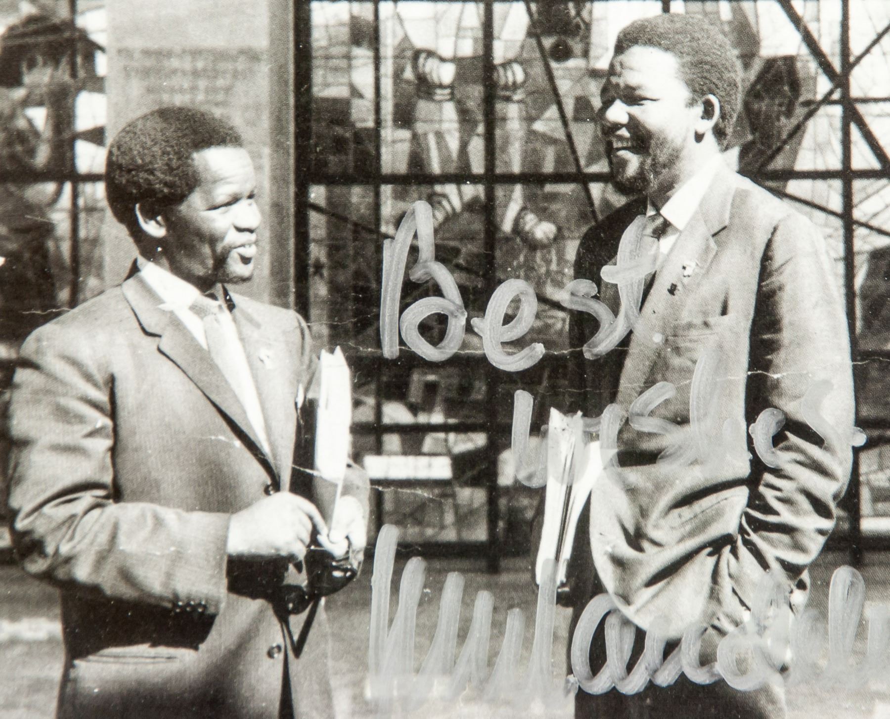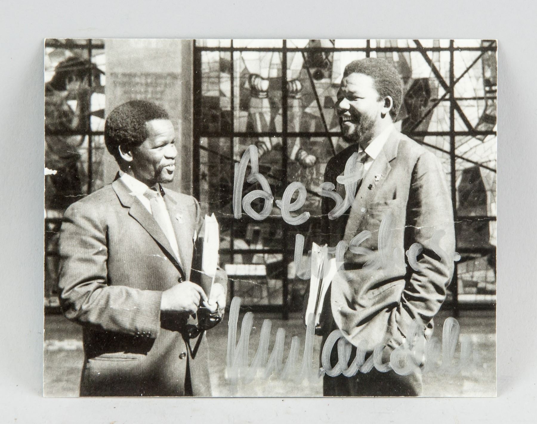 Post-card size print of young Nelson Mandela and Walter Sisulu. The picture has been autographed and inscribed by Nelson Mandela. The piece is rare as Mandela seldom insribed "Best wishes" and even more rarely he would inscribe "Best wishes" to a picture. The autographed picture comes with a certificate of authenticity from forensic handwriting expert and Nelson Mandela autograph expert, Cecil Greenfield. Nelson Mandela was a civil rights activist, Nobel Peace prize winner and the first black South African president. 10 x 12.5 cm (3.9 x 4.9 inches). PROVENANCE: Private collection (Monte Vista, South Africa)