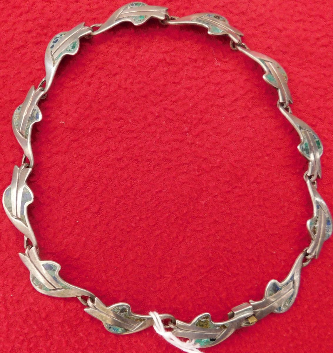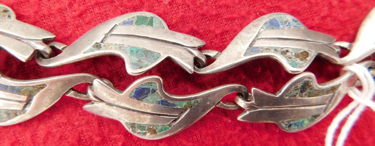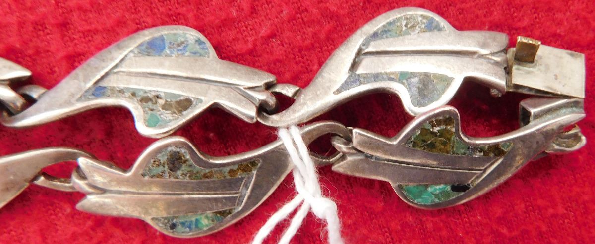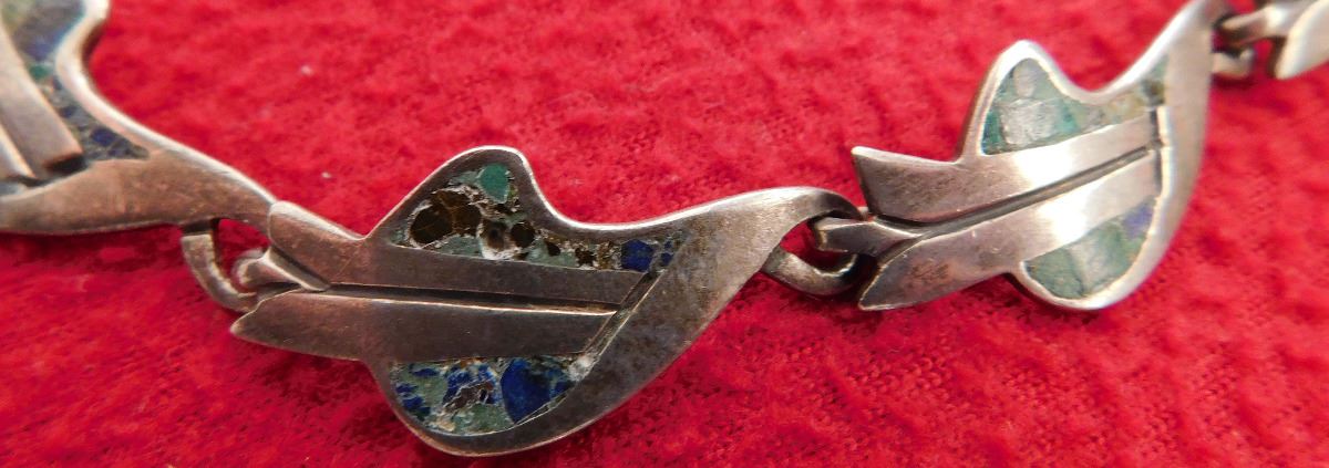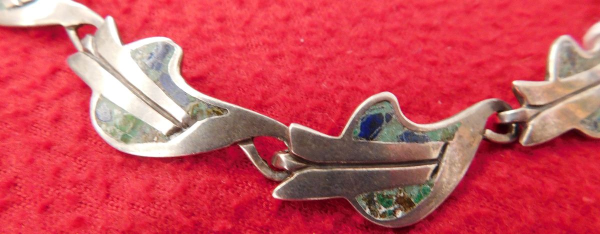 Signed Nestor Sterling Taxco Necklace, circa 1960s. Made of sterling silver and turquoise, the item measures 15" x 0.5". Taxco, MX. The links on the necklace appear to be bird heads. Lot weight is approx. 38 grams. Condition: Well-worn, missing some stone inlay, see images. Shipping: $16.50 w/insurance and signature.