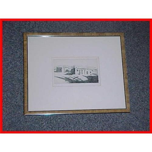 This 12" by 14-1/2" framed pencil-signed print is of a New Mexico pueblo image. The 3-1/2" by 6" image is signed, numbered and titled by the artist; but I can not read the signature. I would guess the age in the 1940's because of the slightly scuffed frame. Print looks in good condition, but I have not taken out of the original frame(So sold "as is"). There is a "Wollheims' Rosequist Galleries" of Tucson, Arizona label on the back. I bought this at an estate auction of a well-traveled "snowbird" person.