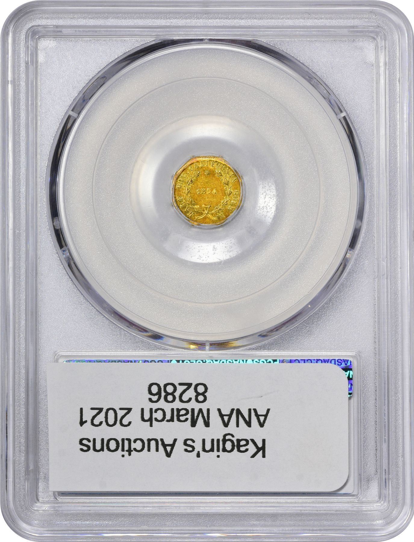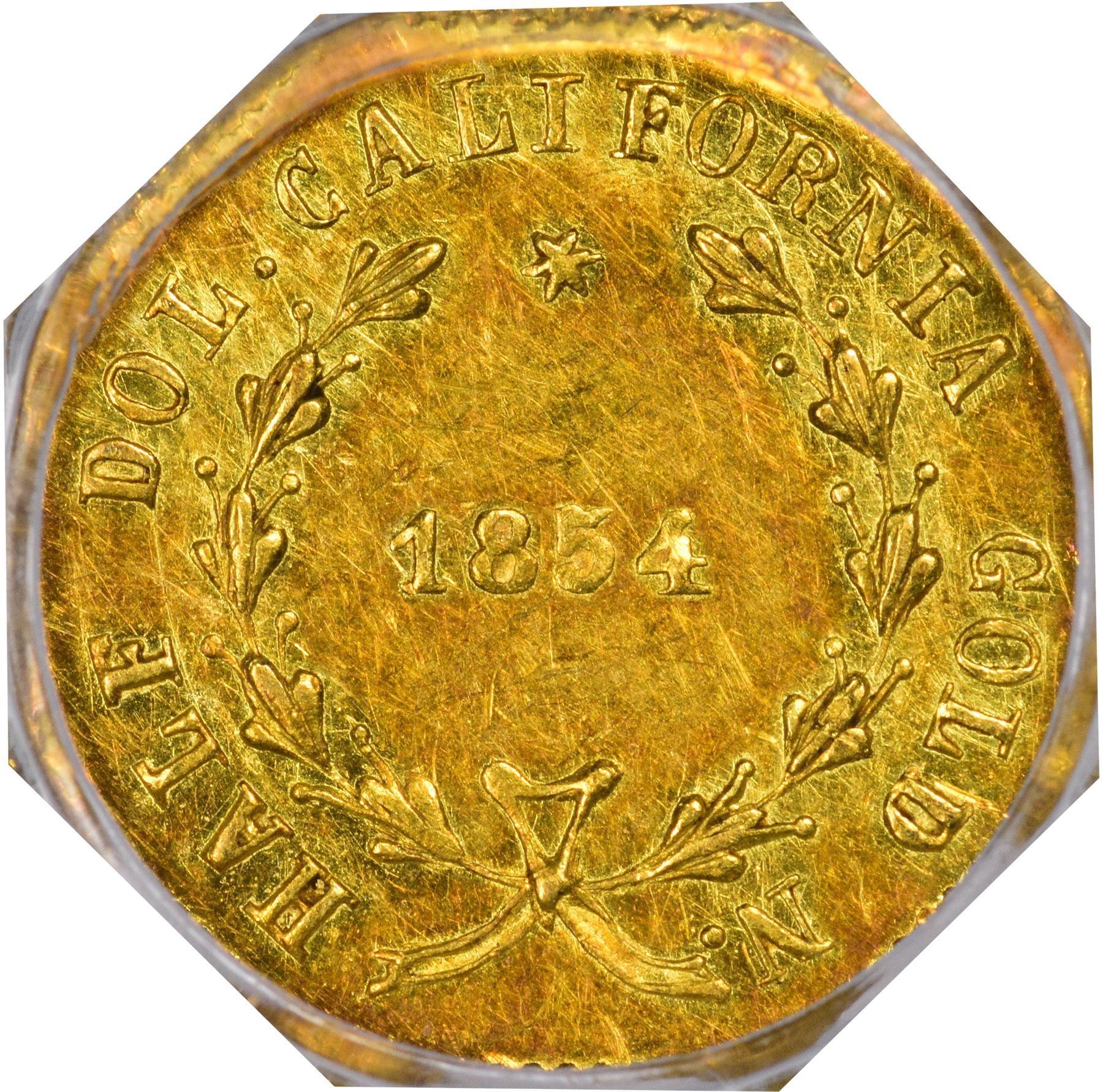 Description: 1854 N. octagonal Half Dol., BG-308, PCGS MS62. An example of this type was mailed by California gold miner Jacob D. Brown to his sister Leah in Joliet, Illinois, probably in 1854 or shortly thereafter (original letter lost). Signed by Antoine Louis Nouizillet. Small head, 13 stars around; HALF DOL. CALIFORNIA GOLD N. around date within wreath, star above. Sharply struck, Brilliant, reddish toning in fields. PCGS MS62 William C. O’Connor (PCGS# 10428).