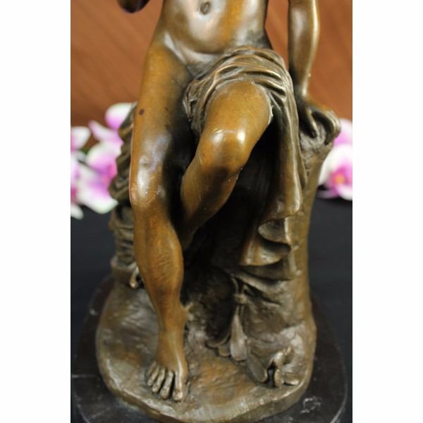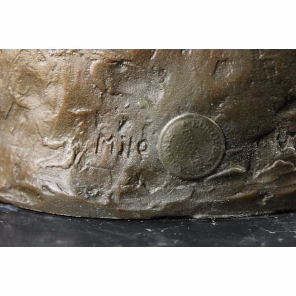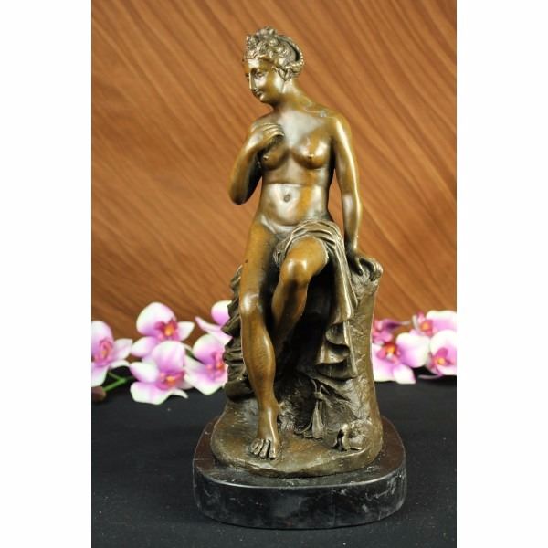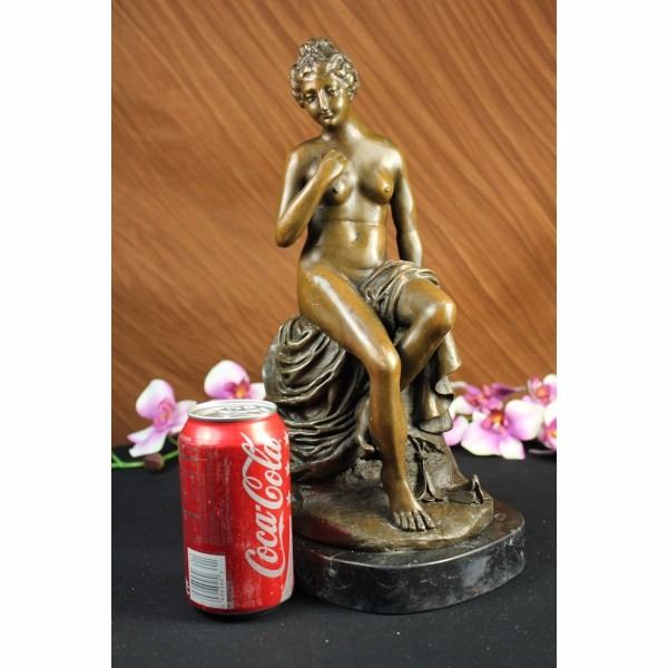 This humble beauty sits sweetly for a portrait. She balances off the edge of a rock by the sea. A cloth drapes over one leg. She rests a hand gently on her chest. She gazes out with a look of serenity. Her hair is pulled up in a loose curly bun. She doesn't seem to be shy about her exposed body. 100% bronze and handmade, this brown patina sculpture was cast using the "Lost Wax Method" and mounted on a marble base. It features the signature Milo. Condition: This sculpture is in perfect condition. Bronze Dimensions with Marble Base:Height 14" x Width 7 1/2" Marble Dimensions: Diameter 7 1/2". Height without base: 13" Weight : 12 LBS Inventory : 25DS0336552