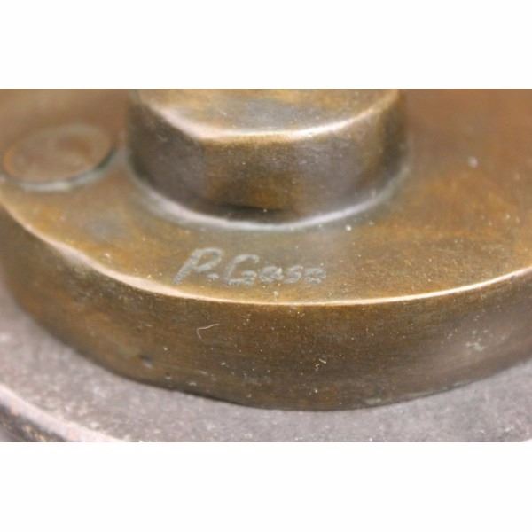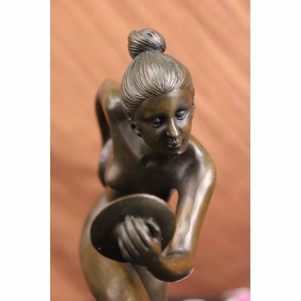 She is more than a dancer. She is a exhibitionist. A woman puts on an eye-catching show. She dances in the nude, kicking up a slender leg, while playing cymbals. She balances on the tips of her toes, showing off her long body. As she kicks her narrow waist cinches in and her back curves. 100% bronze and handmade, this brown patina sculpture was cast using the "Lost Wax Method" and mounted on a marble base and is signed P. Gaso. Condition: This sculpture is in perfect condition. Bronze Dimensions with Marble Base:Height 15" x Width 7" Marble Dimensions: Diameter 6" Height without base: 132" Weight : 12 LBS Inventory: 41DS1703441