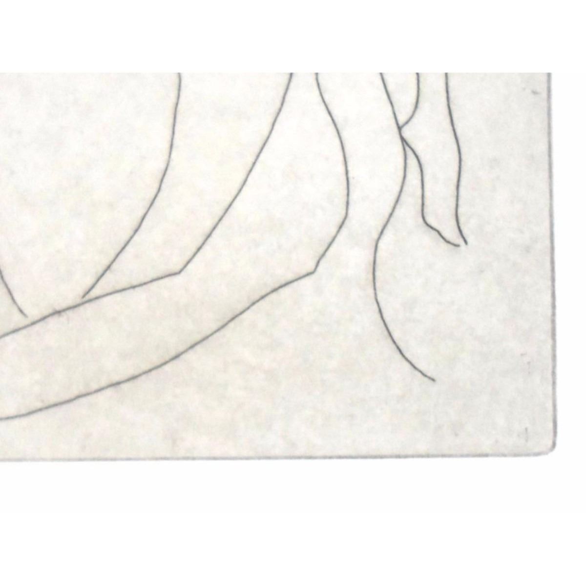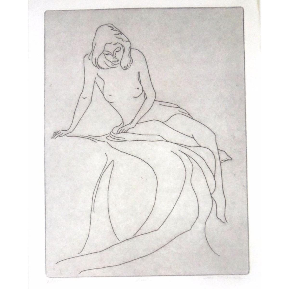 Signed & numbered etching, created by the artist Hal Singer ( 1919-2003 ) toward the end of the last century. The subject is a reclining nude woman, drawn from just a few continuous lines. While the subject is typical of Singer, the style is not. It is number 6 of an edition of 75. Sheet size is 10 1/2" X 13 3/4". Plate mark dimensions- 8 3/4" X 11 3/4". The etching from a cache that has probably been in storage since the prints were created. They may have some minor corner folds but they are otherwise pristine. Singer received his art training at New York University and the Art Students League of New York. The subjects of many of his paintings are women in soft backgrounds with relaxed poses, often in partial shadow. The etching for sale is from a recently discovered group,  signed, numbered & titled in pencil along the bottom. These etchings have never been framed & generally pristine. Â