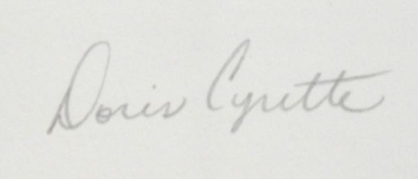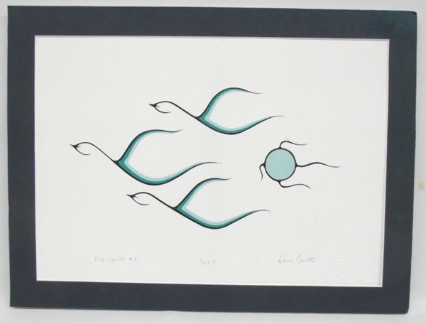 Signed Numbered Print Doris Cyrette Canadian. Stylistic and spare, the artwork of Doris Cyrette invites the viewer to participate in the creative process. She is a native Canadian, born in Ontario and living now in Manitoba, Canada. The print measures 8l.5''H x 12.5''W and is on foam board, under a mat. It is signed, numbered, 9/10 A.P. and is titled ''Free Spirits #2.'' There is a small smudge on the top ''fin'' of the round fish (?).