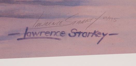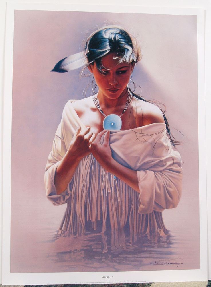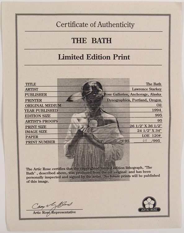 This is a 1995 signed & numbered print by Lawrence Starkey titled The Bath. Hand-signed and numbered in pencil (number 68 of 995) by the artist. Printed on heavy (120 lb.) paper. Includes certificate of authenticity from the gallery. Purchased directly from the publisher, Artic Rose Galleries in Anchorage, Alaska, in the 1990s. SIZE: Image: 24 1/2" x 34". Overall: 26 1/4" x 36 1/2".