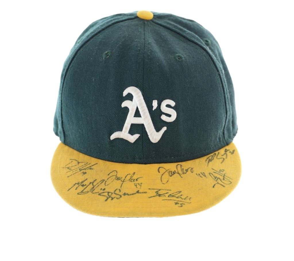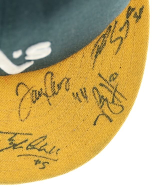 For your consideration is this signed Oakland A's children's hat with eight signatures. The hat shows the iconic color combination of forest green and yellow with a large "A's" logo front and center in white. The brim of the hat holds the eight signatures, with all being illegible. The hat shows good condition overall with some slight wear but no obvious signs of damage are present. The hat measures 10" L x 7" W x 5" H and an inside circumference of approximately 20".
