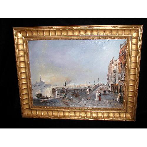 Detailed oil painting of C.1900 Venice in wonderful color tones. Painted on wood. Signed by the artist lower right corner "Gardiny" and hung in a French home in France for many years until purchase. Framed in a gilt 3 inch wood frame which was replaced or framed at a much later date than the oil on wood. Excellent condition. Oil measures 15.75L X 12H,framed 19.75L X 15.75H X 1.5.