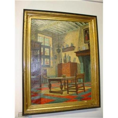 The oil painting is of an interior scene of a country French room. It's bright and lively colors give this piece a wonderful feeling. It would go well in any environment or style.