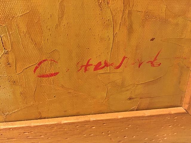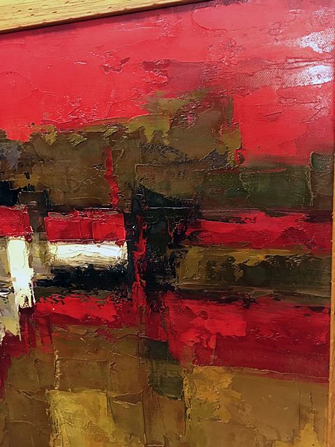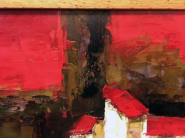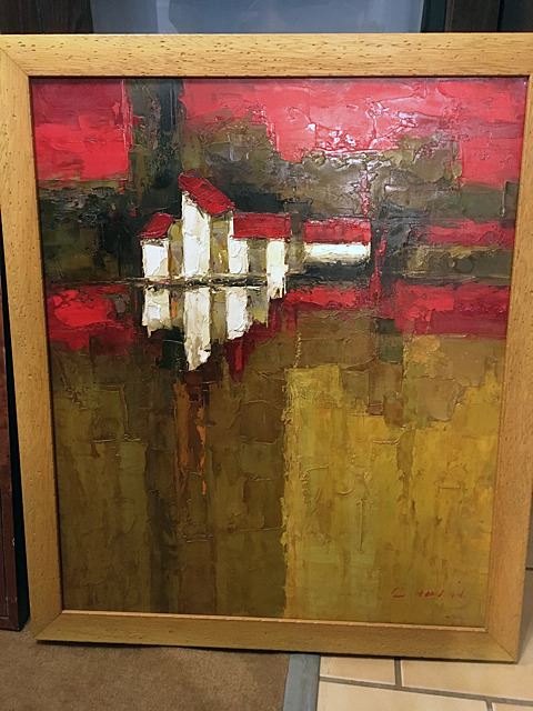Signed oil painting on canvas, framed, measures approx. 22 1/2" wide x 27" tall. Abstract style painting of villageon water with reflection. Bright, bold colors of reds and golds with white accents.