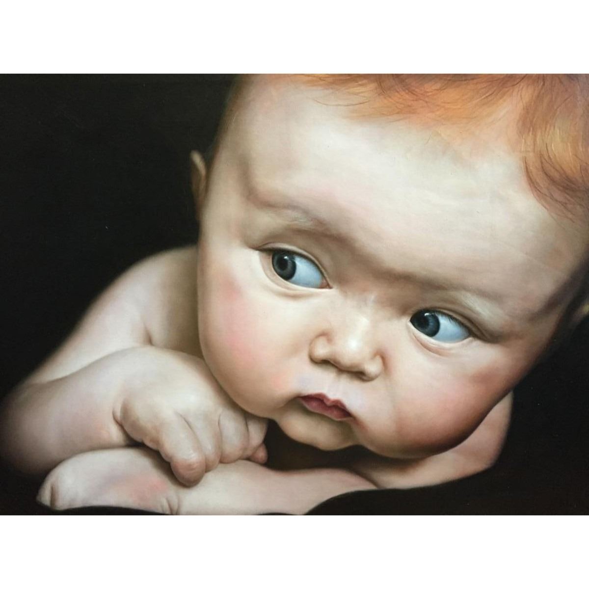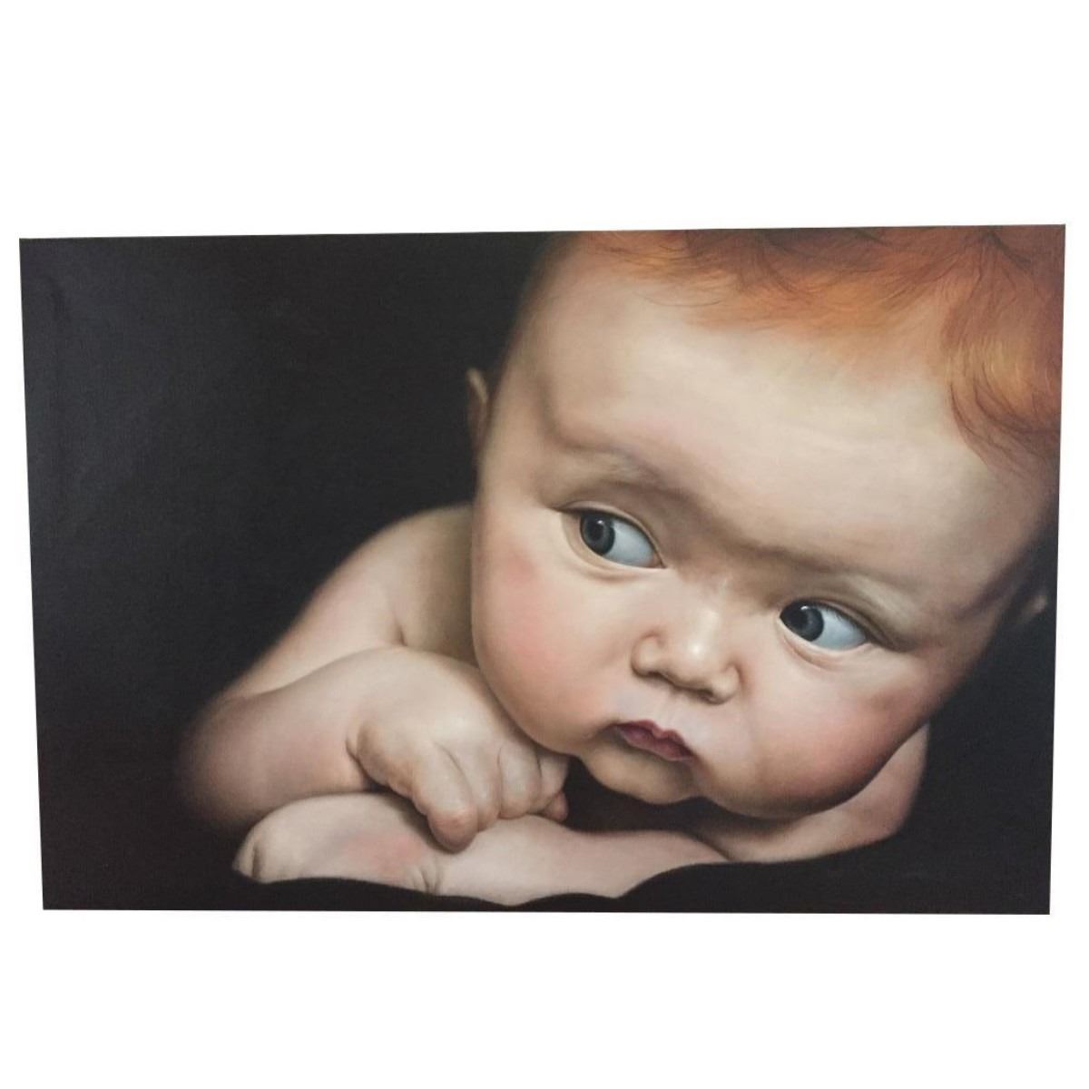 21st Century Photo-realism, oil on canvas painting of a baby with red hair, signed on the reverse. 20" X 30" on stretched linen canvas