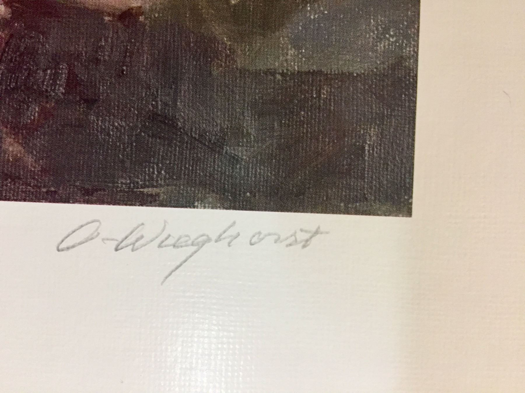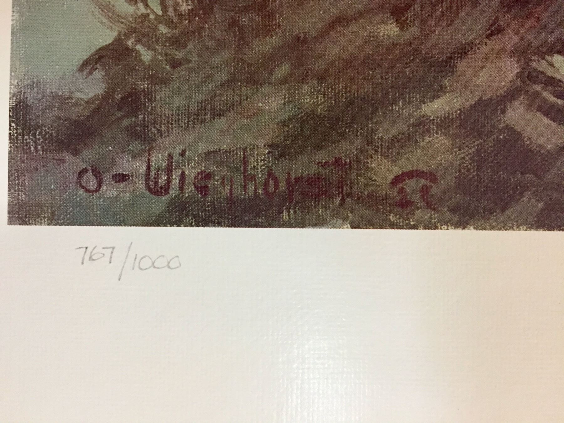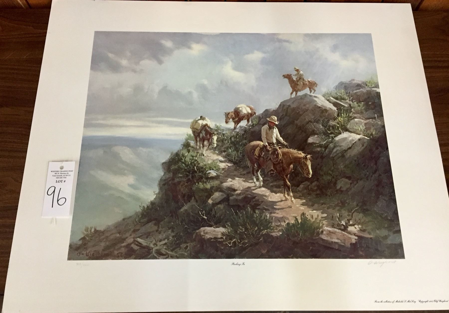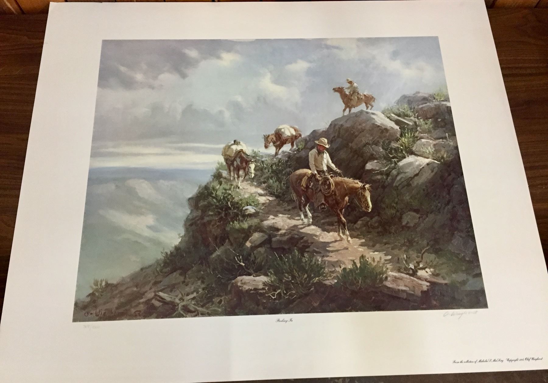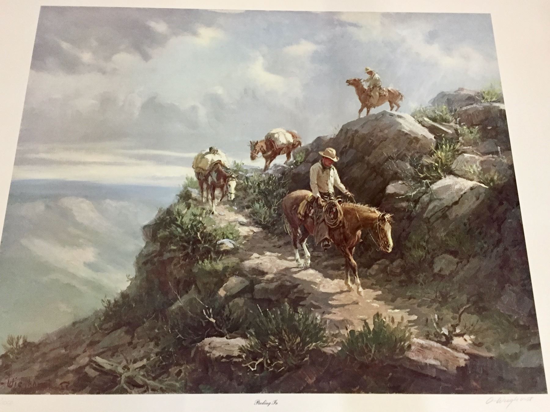 Description: Offered for sale in this lot is a signed Olaf Wieghorst limited edition print. It is titled, Packing In and features a pack train coming down the trail. Print # 767/1000. Maker: Olaf Wieghorst. Approx. Age: Vintage. Size: 32 inches wide x 26 inches long. Condition: Good for its age, normal wear expected. Please look closely at the pictures - they are an important part of our description. Shipping: There will be a $10 handling, packaging fee for shipping this lot. The actual cost of postage will be added on top of that.