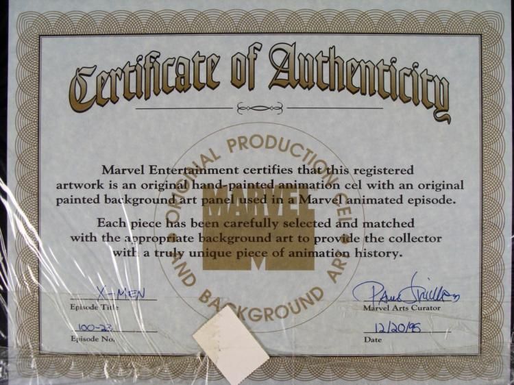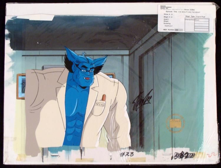 This is an original signed production cel and background from the hit series X-Men. Stan Lee signature is located on the right of cel in black sharpie. * * Under a cloud of increasing anti-mutant sentiment, Professor Xavier creates a haven at his Westchester mansion to train young mutants to use their powers for the benefit of humanity, and to prove mutants can be heroes. Xavier recruited Cyclops, Iceman, Angel, * Beast and Jean Grey calling them "X-Men" because they possessed the "x-gene", an ability normal humans lacked. Early issues introduced the team's arch enemy, Magneto and his Brotherhood of Evil Mutants, who would later battle the X-Men for years. * * Beast is Henry McCoy * * * * * Original Animated Cel & Production BackgroundMedium: Hand painted acetate celDetails: Animation notations and peg holes * * Overall Size of the Cel: 10 1/2" x 12 1/2" * Overall Size of the background: 10 1/4" x 15" * Excellent Condition * This is an original hand-painted cel set-up used in the production of an episode of X-Men titled "Beauty and the Beast." Each one-of-a-kind set-up represents a slight change in position of the characters. When individually photographed and projected in rapid * succession, the images appear to move. * * To create production cels, the original animator's drawing is transferred onto an acetate cel (by hand-inking and/or photo copying). The cel is then hand-painted on the reverse side. The background accompanying this set-up is an original production background. * * * The cel and original background is ready to be matted and framed. The animators notations are located at the bottom of the cel and background. A Certificate of Authenticity from Marvel is on the back of background. * The Marvel Seal is located at the top right of the cel. The cel and background are in a protective sleeve. An information card about the episode is located at the top right of the protective sleeve. *