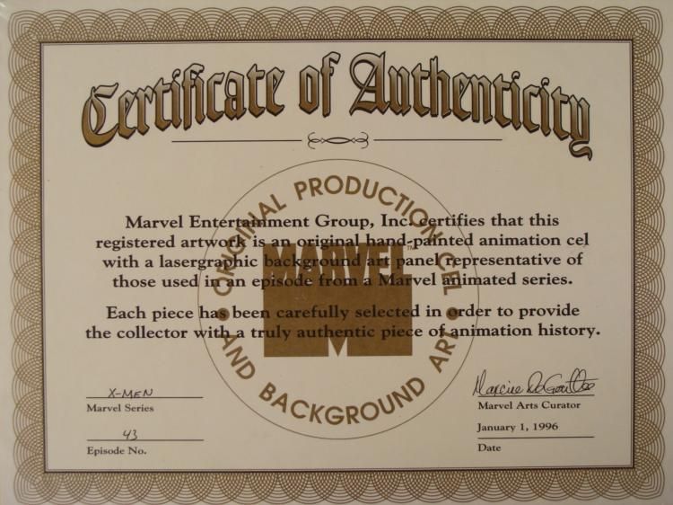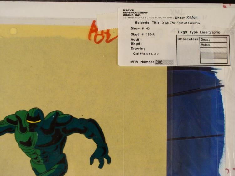 This is an original signed production cel and background from the hit series X-Men. Stan Lee signature is located on the right of cel in black sharpie. Under a cloud of increasing anti-mutant sentiment, Professor Xavier creates a haven at his Westchester mansion to train young mutants to use their powers for the benefit of humanity, and to prove mutants can be heroes. Xavier recruited Cyclops, Iceman, Angel, Beast and Jean Grey calling them "X-Men" because they possessed the "x-gene", an ability normal humans lacked. Early issues introduced the team's arch enemy, Magneto and his Brotherhood of Evil Mutants, who would later battle the X-Men for years. Beast is going to destroy that robot! Original Animated Cel & Lasergraphic BackgroundMedium: Hand painted acetate celDetails: Animation notations and peg holes Overall Size of the Cel: 10 1/2" x 12 1/2" Overall Size of the background: 10 1/4" x 15" Excellent Condition This is an original hand-painted cel set-up used in the production of an episode of X-Men titled "The Fate of Phoenix." Each one-of-a-kind set-up represents a slight change in position of the characters. When individually photographed and projected in rapid succession, the images appear to move. To create production cels, the original animator's drawing is transferred onto an acetate cel (by hand-inking and/or photo copying). The cel is then hand-painted on the reverse side. The background accompanying this set-up is a lasergraphic printed background. The cel and original background is ready to be matted and framed. The animators notations are located at the bottom of the cel and background. A Certificate of Authenticity from Marvel is on the back of background. The Marvel Seal is located at the bottom left of the cel. The cel and background are in a protective sleeve. An information card about the episode is located at the top right of the protective sleeve. The cel has multiple layers