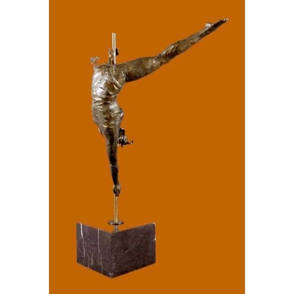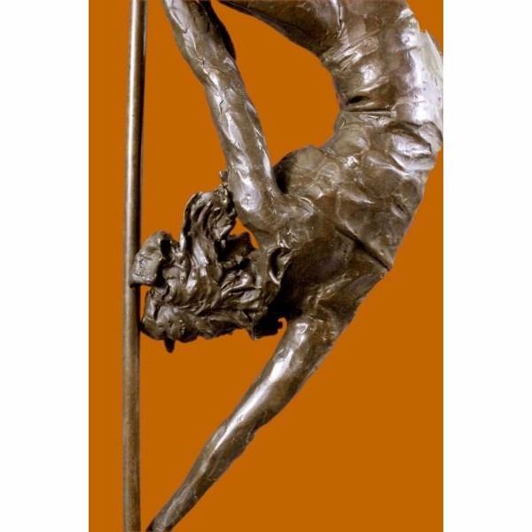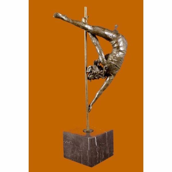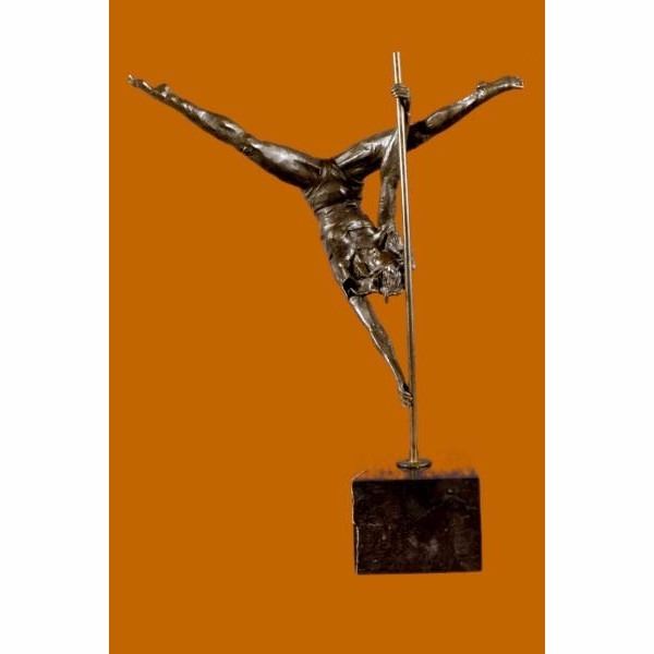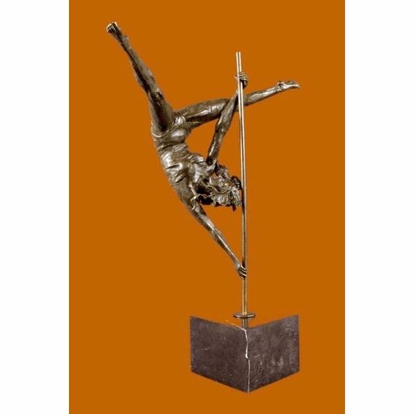 This woman is a talented Gymnast demonstrating her agility and flexibility. Balancing on a pole as she has trying to amuse you. Her muscular legs curve backwards and rests in her hands on her shoulders. She is semi nude that highlights her athletic body. This sculpture was crafted using the lost wax method. It mounted on a black marble base. It is signed by artist Aldo Vitaleh. Condition: This sculpture is in perfect condition. Bronze Dimensions with Marble Base:Height 19" x Width 14.5" Marble Dimensions:5" X 5" Height without base: 15.5" Weight :14 LBS Inventory : 98XNCH5938589
