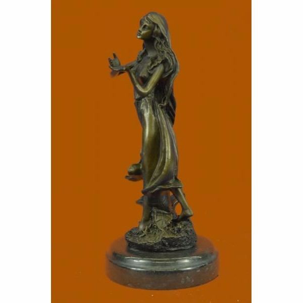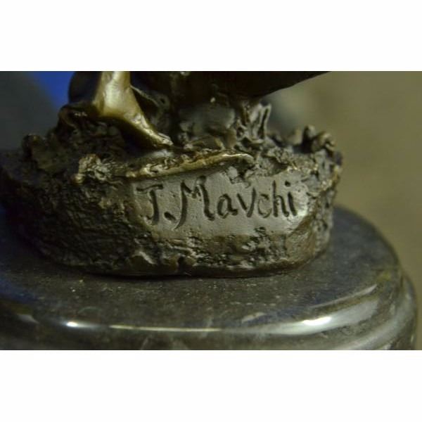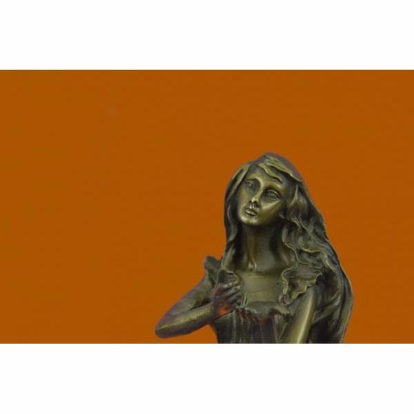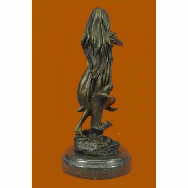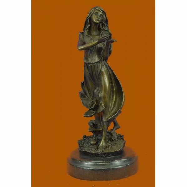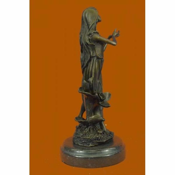 Get lost in a daydream. She leans back on a tree stump and flowers grow all around her. She stretches an arm out to feel the blossom graze her skin. She is one with them as they curvearound her.Her soft silk dress clings to her curves. She is a serene and dreamlike reminder to take a moment out of any hectic day to smell the roses.100% bronze and handmade this brown patina sculpture was cast using the "Lost Wax Method" and mounted on a marble base and is signed J.Mavchi. Condition: This sculpture is in perfect condition. Bronze Dimensions with Marble Base:Height 10.5" x Width 4.5" Marble Dimensions:Diameter 4.5" Height without base: 9.5" Weight : 5 LBS Inventory : 32YRD12613423