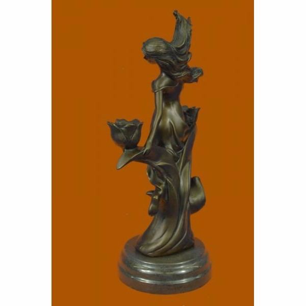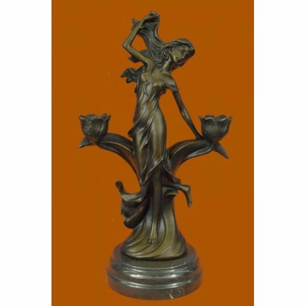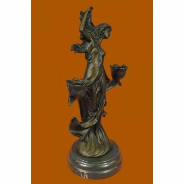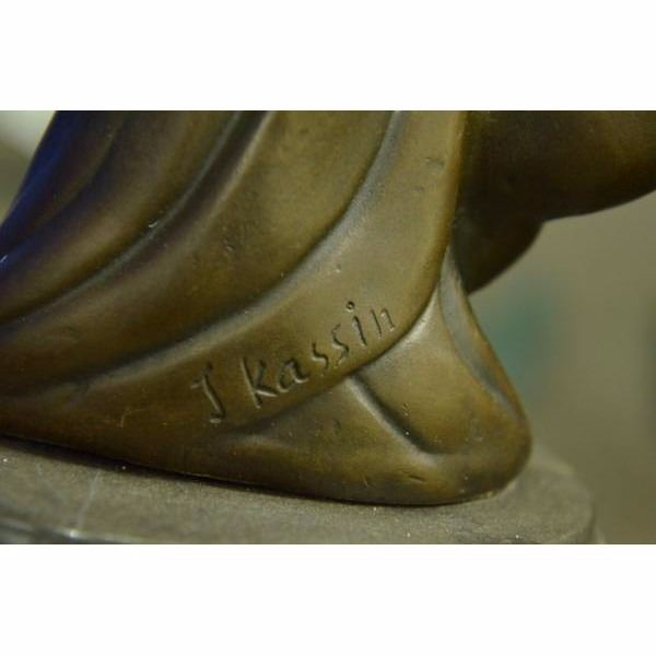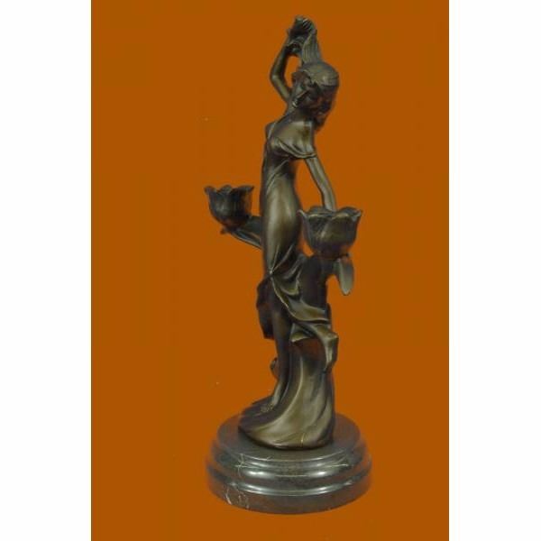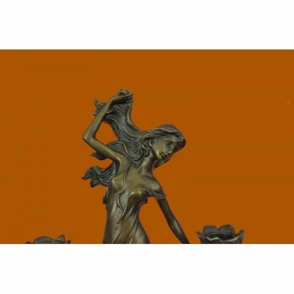 This gorgeous candle holder depicts a woman relaxing as she wipes the sweat from her forehead. She places one hand behind her and exudes beauty from her inner being. She is dressed in a gorgeous flowing rode that hugs her legs up to her thigh. Her robe bunches at the floor and fans out around her. Her hips help break up the sculpture giving the viewer more dimension to the eye. The flowers in the sculpture are disguised candle holders, once a candle is light and placed in the sculpture the candle light that reflects off of the sculpture is an absolutely gorgeous and breathtaking sight, adding ambiance and aesthetics to any room. This is an extremely gorgeous candle holder that is sure to add a pinch of elegance to your Living room, Home and is signed by artist J. Kassin. Condition : sculpture is perfect condition. Each Bronze Dimensions with Marble Base:Height 14.5" x Width 8" Marble Dimensions: Diameter 5" Height without base: 13" Total Weight : 10 LBS Inventory : 15YRD13135751