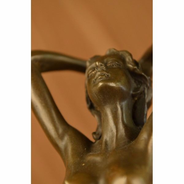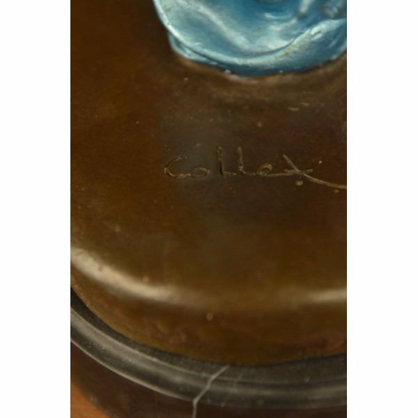 The nude aerialist is seen leaping into the air as a fabric banner, coated in a vibrant green patina, twines itself around her sculpted body.This work of art rejoices the female figure and shows attention to the body under the influence of movement. But most importantly, it's essence characterizes the spirit within the body that wishes to bound out into everything and everywhere. She was cast using the archaic method of lost wax casting and her skin tone stained with a brown patina finish. The sculpture is mounted upon a black marble base with he artist Collet signature. Condition: This sculpture is in perfect condition. Bronze Dimensions with Marble Base:Height 18" x Width 8" Marble Dimensions:Diameter 8" Height without base: 17" Weight :12 LBS Inventory : 68X21615686