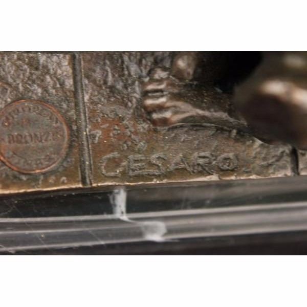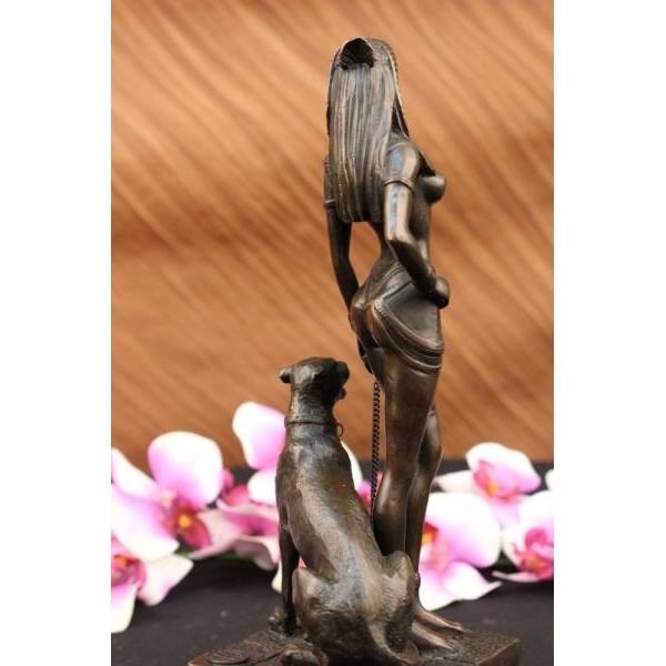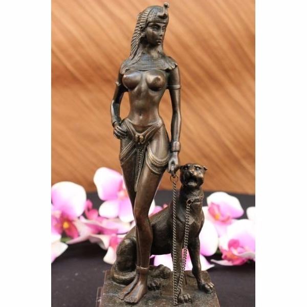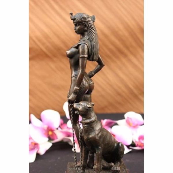 This beautiful sculpture of an Egyptian Queen is gorgeous and has amazing details. She stands in a very sexy position and she wears a little skirt fitted tightly to her waist and thighs. She is bare from waist up exposing her breast, as she gives you a soft yet very firm stare to her left. She has her guard dog there with her to protect her from anyone who comes to close. She wears this astonishing Egyptian style beaded hat over her head to give her more of an accessory exquisite look. Handmade using the "Lost Wax Method" and made of solid 100% bronze with a two tone brown patina and is signed by artist Cesaro. Condition: This sculpture is in perfect condition. Bronze Dimensions with Marble Base:Height 10 1/2" x Width 4" Marble Dimensions:4 " X 4" Height without base: 9 1/2" Weight : 8 LBS Inventory : 53B7613235